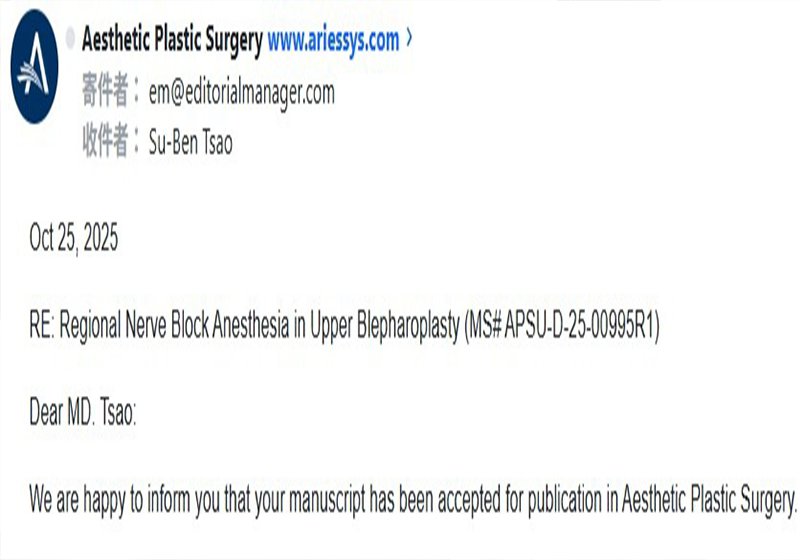 台灣資深整形外科名醫曹賜斌15年完成6099例 上眼皮整形神經阻斷麻醉新法登期刊