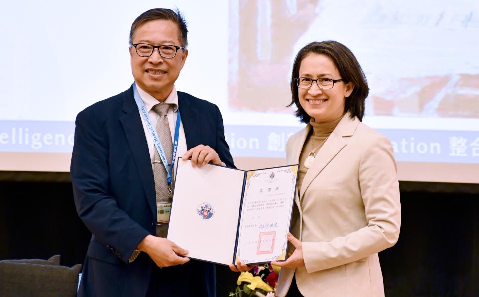 高醫大校長余明隆(圖二左)感謝蕭美琴分享領導經驗與宏觀國際視野,啟發師生發揮專業結合社會使命,謀求全人類福祉,打造幸福正益健康台灣。圖/高醫大提供、文/高培德