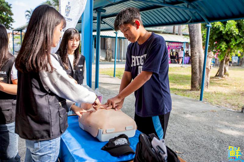 ▲中芸國中同學在嘉藥水活社社員指導下實作CPR,正確掌握按壓位置與頻率