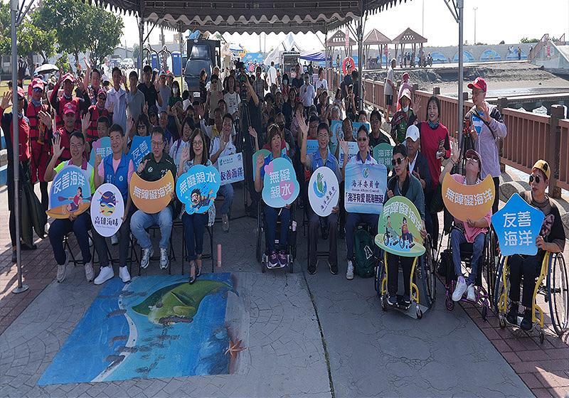 海洋委員會攜手水中運動協會11月16日合辦「勇敢逐浪、無礙前行」無障礙親海體驗活動在高市彌陀漁港海岸光廊舉行,海委會主委管碧玲、高市海洋局長石慶豐、運動發展局長侯尊堯、彌陀區長陳景星、永安區長黃瑞財、彌陀區漁會總幹事林子清、高雄特殊教育學校校長陸奕身、中華民國水中運動協會理事長劉文宏、中華民國身心障礙者休閒運動推廣協會理事長劉耀台、營運長呂嘉儀、國立高雄科技大學副教授丁國桓等人傳遞船槳,宣布領先全台首座無障礙入水輔助平台啟用。