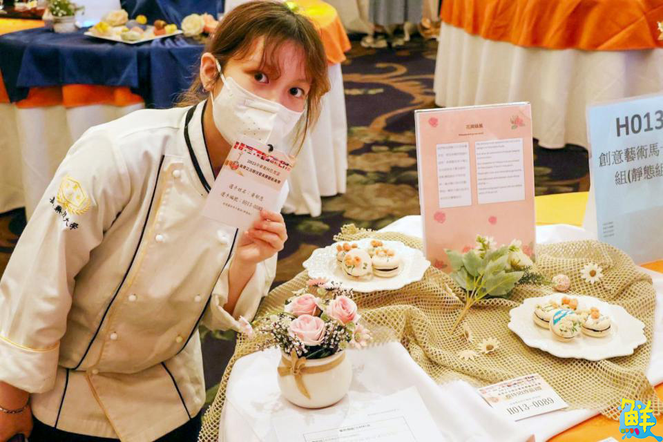 初試啼聲就獲金牌的一年級學生黃彥慈與黃郁恩,分別於「彩繪馬卡龍組」及「創意藝術馬卡龍組」脫穎而出。黃彥慈以「母親節」為主題,在馬卡龍上彩繪康乃馨,內餡更巧妙結合開心果等多元風味,象徵對母親多樣且深沉的情感。對於首次參賽就奪金,她表示,她謙虛地感謝學姊與老師的耐心指導,並期許自己持續精進,挑戰更高的舞台。