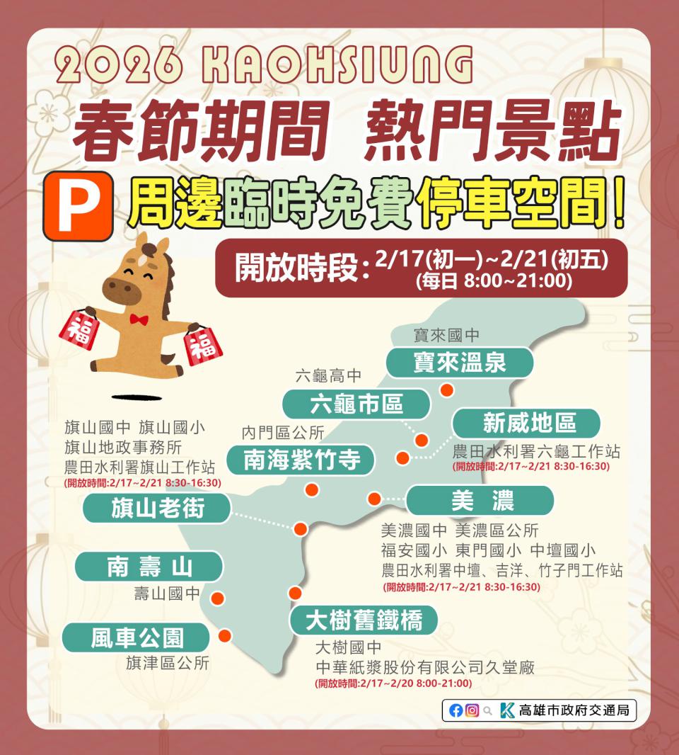 因應春節連假出遊返鄉人潮,高市交通局2 月 17 日至 21 日協調旗津、美濃、旗山老街等 9 處觀光景點周邊10所學校、5處農田水利署工作站、5處高市府機關及1處民間企業,提供 21 處免費臨時停車空間,可容納 721 輛汽車。