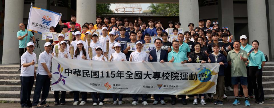 115年全國大專校院運動會聖火隊4月15日抵國立高雄科技大學建工校區,高科大校長吳忠信從國立中央大學副校長阮啓弘手中接過火把並巡禮校園,競技啦啦隊應援助陣,吳忠信續授旗體育室主任李祐穎,期勉網球、桌球、羽球、田徑、游泳、柔道、跆拳道、木球及空手道等代表隊積極備戰,締造佳績。
