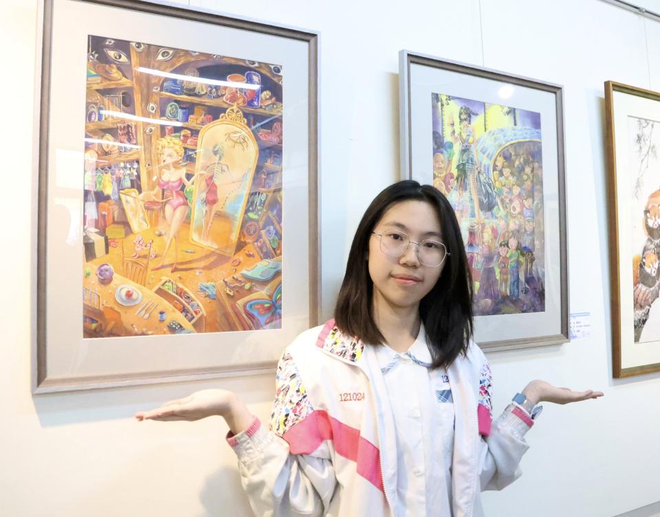 三民國中學生周紓宇漫畫「你還要被世俗的審美挾持多久」(圖二)勇奪114學年度全國學生美術比賽高市初賽漫畫類第一名,描繪美女站立鏡子前,房內卻堆滿美容產品,腰身被畫成僅剩一條線,與鏡中骷髏形象對比強烈。周紓宇說,社群媒體與流行文化影響,透過創作諷刺社會畸形審美標準。