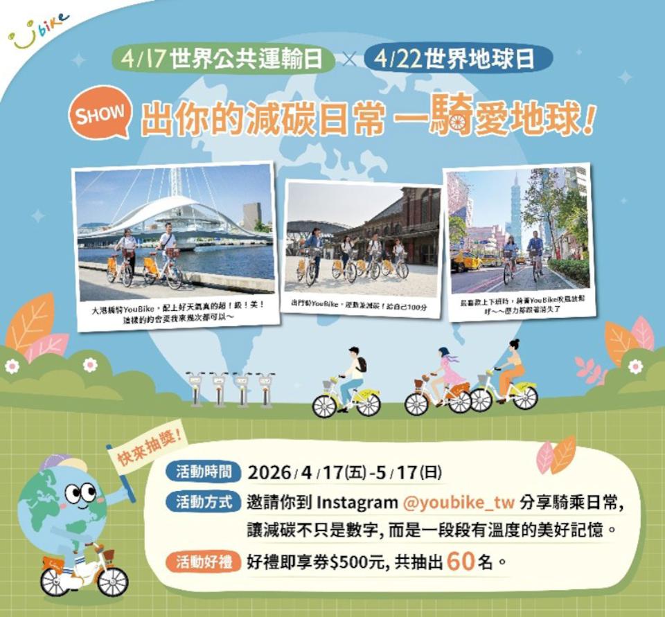 響應4月17日世界公共運輸日及4月22日世界地球日,高市交通局攜手微笑單車即日起至5月17日合推「SHOW出您的減碳日常 一騎愛地球」活動,民眾上網分享騎乘公共自行車(YouBike)經驗,有機會抽中市值500元好禮即享券,限額60名,禮券適用量販、美妝品牌、美食餐廳,更多資訊可上微笑單車官網查詢。圖/交通局提供、文/高培德