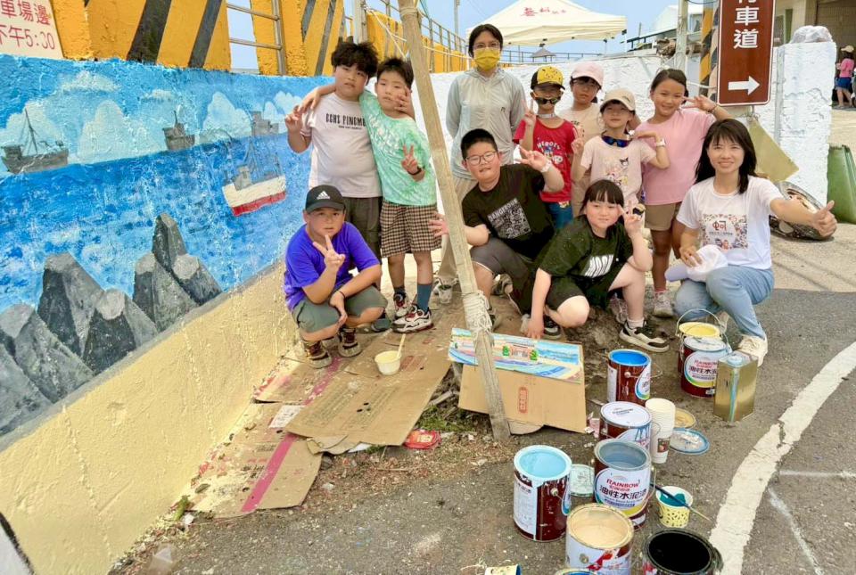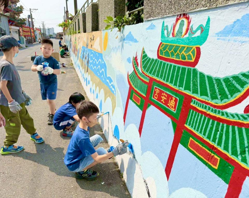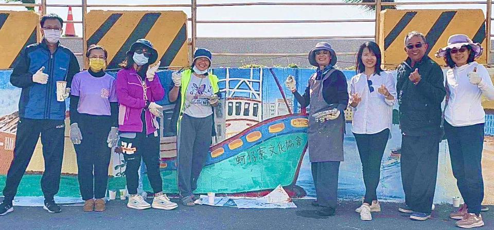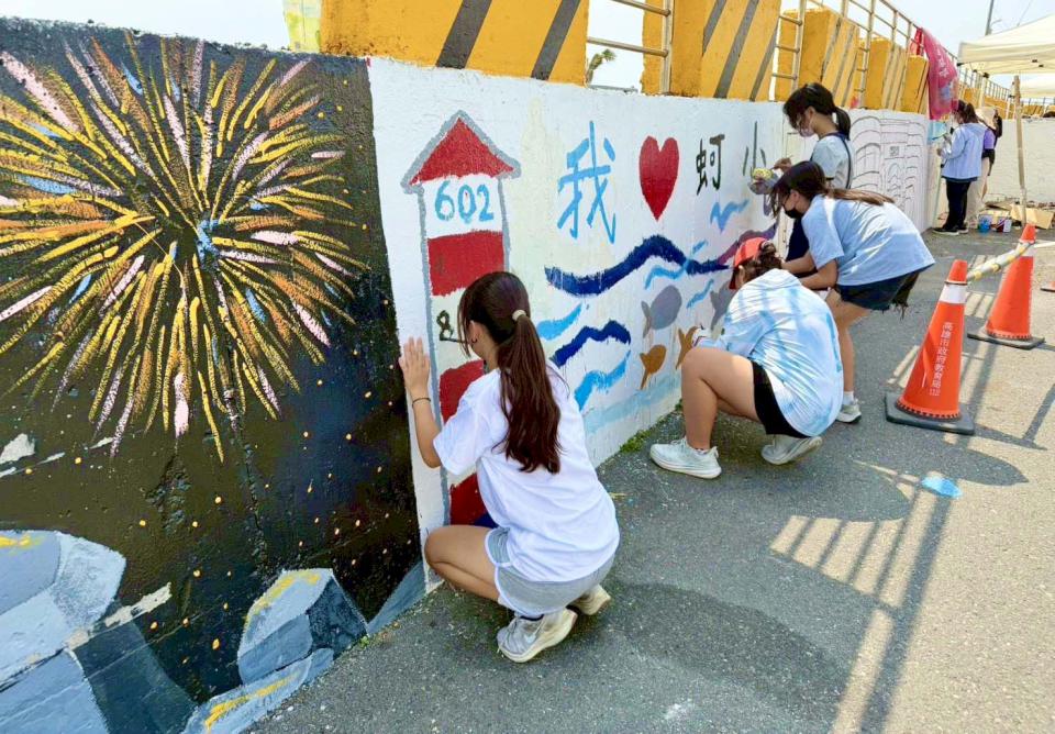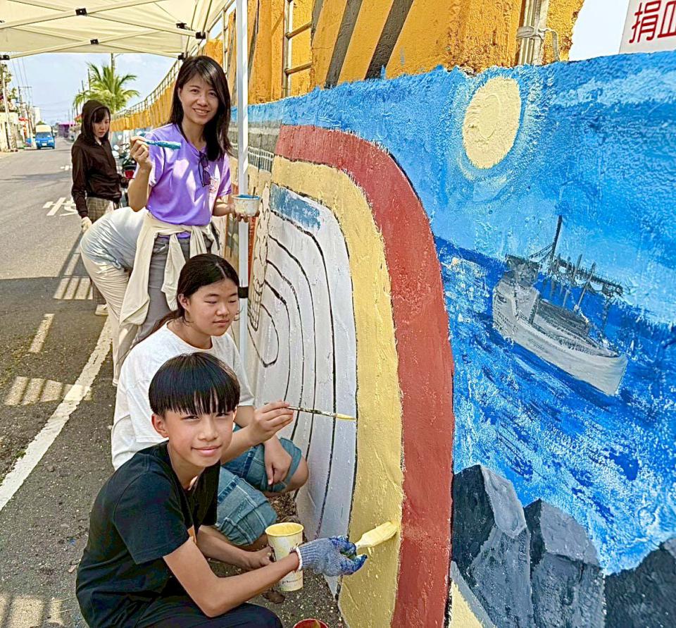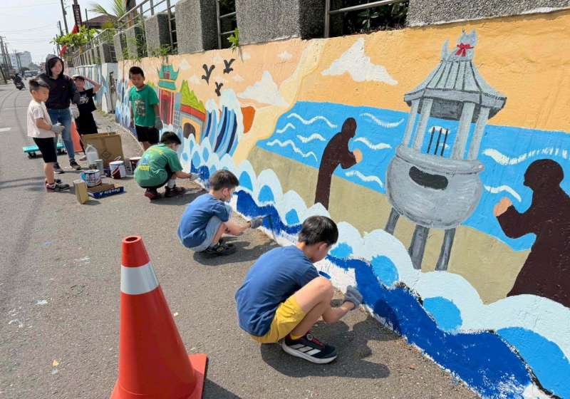 彩繪牆聚焦蚵子寮敘事,譜寫家鄉前世今生,從「驚滔駭浪」重現早期討海生活、「靈威守護」祈願平安豐收,延伸「漁躍港灣」傳達漁船外銷及烏金產業繁榮,學生落款「海洋永續」,呼應聯合國永續發展目標(SDGs)觀念。