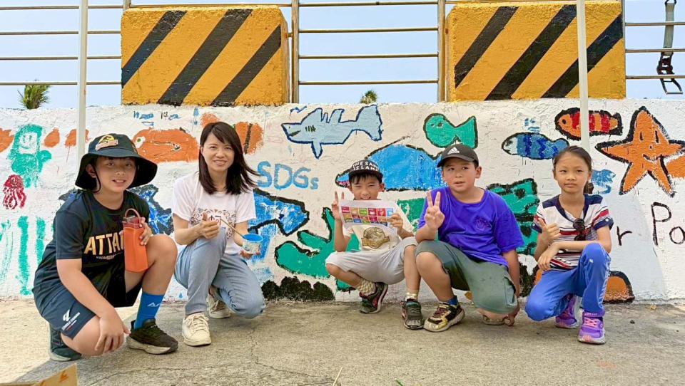 王佐宇說,能彩繪圍牆好酷,樂見眾多海洋生物增添家鄉美好,林宥宇也結合世界地球日「Our Power, Our Planet」手繪聯合國永續發展目標,展現守護海洋生態落實永續發展決心。圖/教育局提供、文/高培德