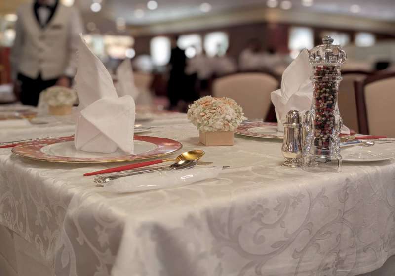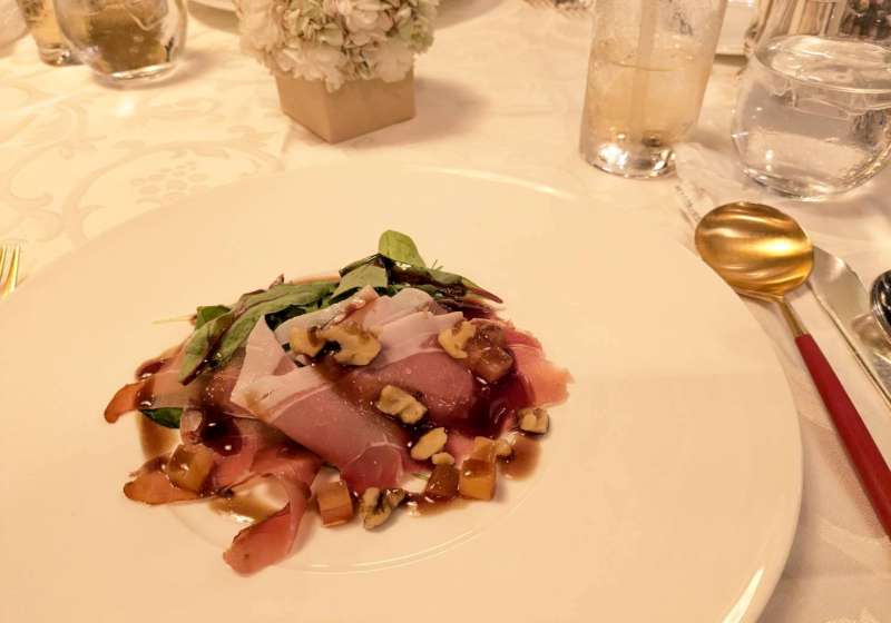 店內燈光溫柔,白色桌巾、金色餐具在燭光下閃著柔亮的光。客人們低聲交談著,每個人都盛裝出席,女士們穿著優雅的禮服、或是日本和服,先生們也都打扮得相當正式。彷彿電影裡的場景。