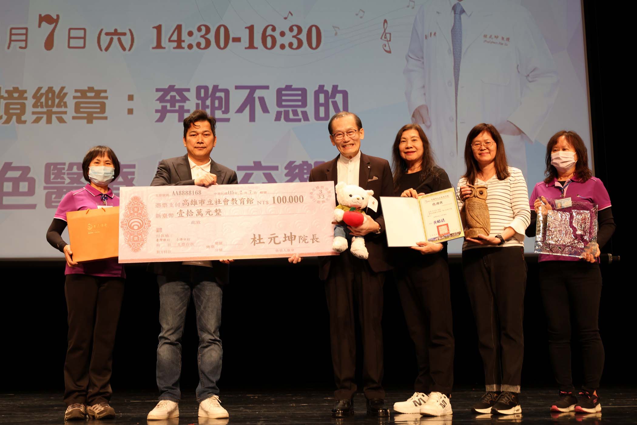 杜元坤開場捐資館方10萬元,挹注推動多元學習與公益講座,館長黃昭誌代表接受並回贈感謝狀、貓頭鷹、幸福平安熊、養生堅果與蓮花藝術玻璃盤等。