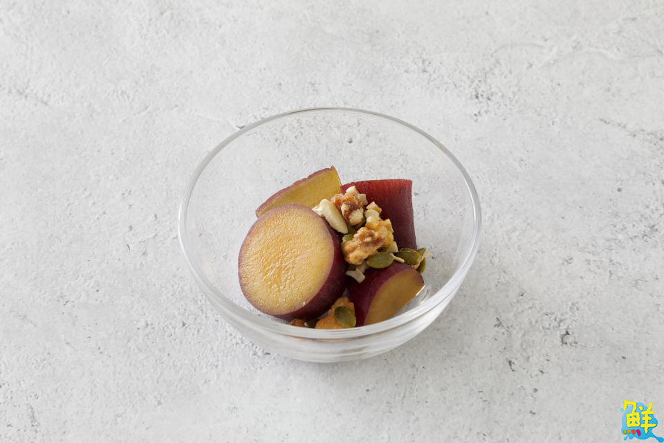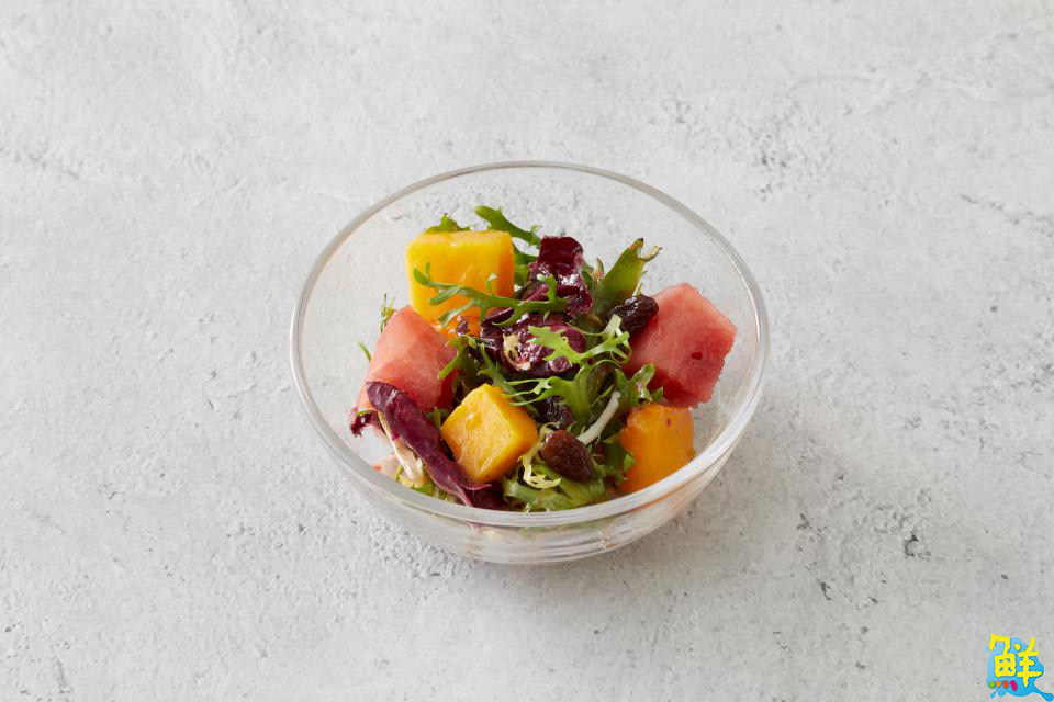 「金時美人蜜甘藷」則選用台灣在地甘藷,以醬油、本和香糖與蜂蜜醃製,待烘烤後再予以冷卻,讓口感更有彈性的同時也保留甘藷本身的自然滋味。最後一道「季節沙拉」選用當季葉菜搭配新鮮水果,包含夏日盛產的芒果與西瓜,以檸檬與醋簡單調味,呈現酸甜平衡的清脆口感。