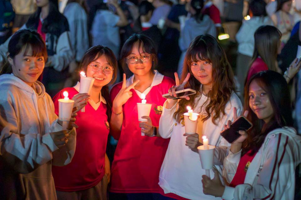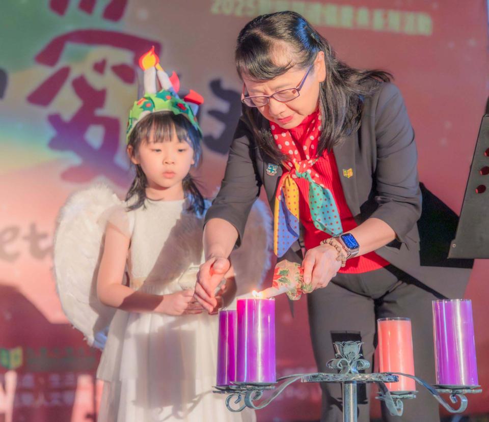 文藻外大管樂社、詠安內思合唱團聖誕組曲炒熱氣氛,小天使依聖路濟亞傳光儀式點燃燭光,校長莊慧玲接過傳遞,祈願天主祝福恩典,典禮同步視訊連線澳洲雪梨校友會會長陳韻筑、新加坡校友會會長番珍娟,越南校友會會長張勤芝等人,完成倒數齊喊「文藻60‧生日快樂」,開心同框合影。