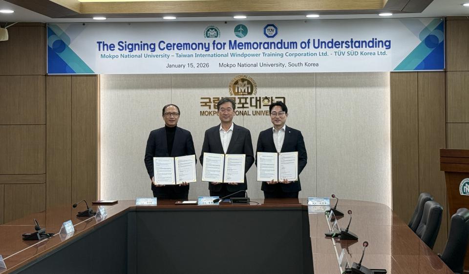 臺灣港務轉投資臺灣風訓攜手南韓國立木浦大學、國際認證機構 建構專業風場人才庫 2026/01/15 高培德 516臺灣港務轉投資事業臺灣風能訓練董事長(圖一左)盧展猷1月15日與南韓國立木浦大學校長宋河哲(圖一中)、國際認證機構TÜV SÜD Korea 執行長徐正旭(圖一右)簽署合作備忘錄(MOU),宣示打造全球風能組織培訓中心進駐南韓全羅南道,盧展猷說,全羅南道離岸風電產業興盛,合作移轉技術同時深度整合跨國產業鏈,期能輸出台灣營運經驗,協助建構支持大型風場專業人才庫。圖/臺灣港務提供、文/高培德 #高雄捷運報 #高雄在地媒體 #高雄新聞 #鮮新聞 #高雄新聞網 #臺灣港務