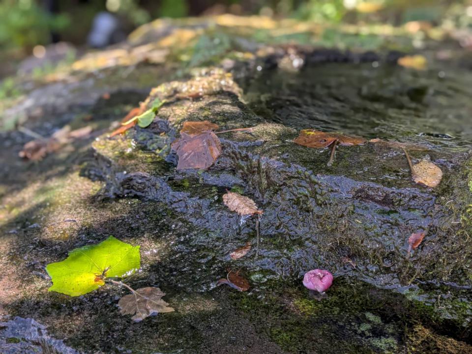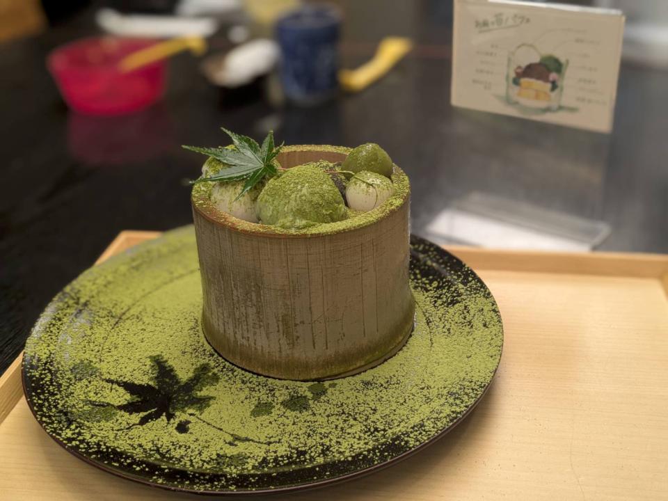甜點一上桌,馬上成了焦點。表面灑滿抹茶粉,唯獨中間留下一片「楓葉」的形狀。望著碗裡,彷彿能感受到今年熾熱的天氣,初秋的氣息,稍稍驅散了暑意。