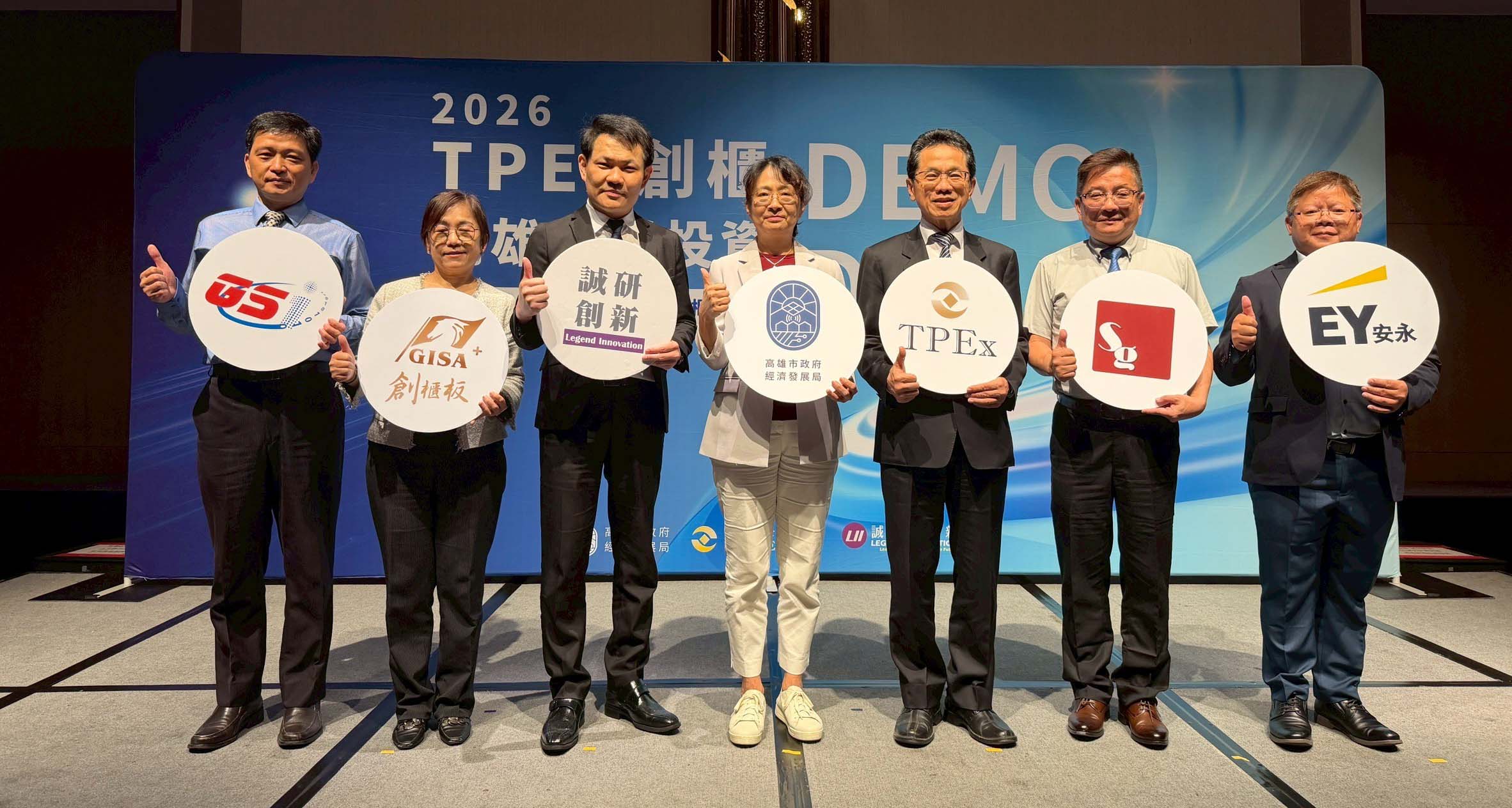 高市經發局攜手證券櫃檯買賣中心、誠研創新合辦2026年第三屆 TPEx創櫃X高雄創業投資 DEMO DAY3月27日在左營區星級飯店舉行,主辦單位從37組新創團隊中遴選9家產業化人工智慧、綠色經濟、線上線下融合(OMO)商業模式企業參與,其中6家獲創櫃板推薦資格申請輔導登錄,另5家透過高市KO-IN智高點、DAKUO數創中心、大港創艦等新創基地孵化育成,串連企業創投(CVC)與櫃買中心資源,強化團隊募資能力,深化新創企業與投資機構合作,經發局副局長陳怡良(圖一中)、櫃買中心董事長簡立忠(圖一右三)等人合影。