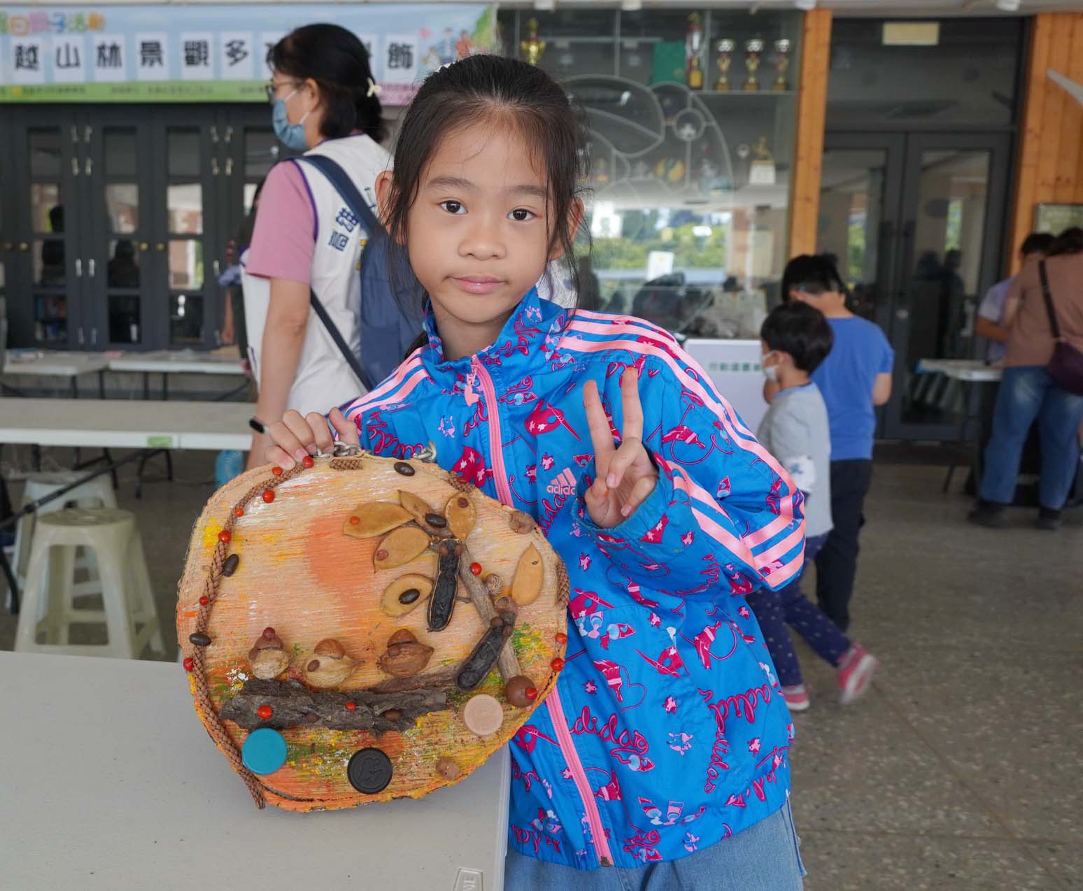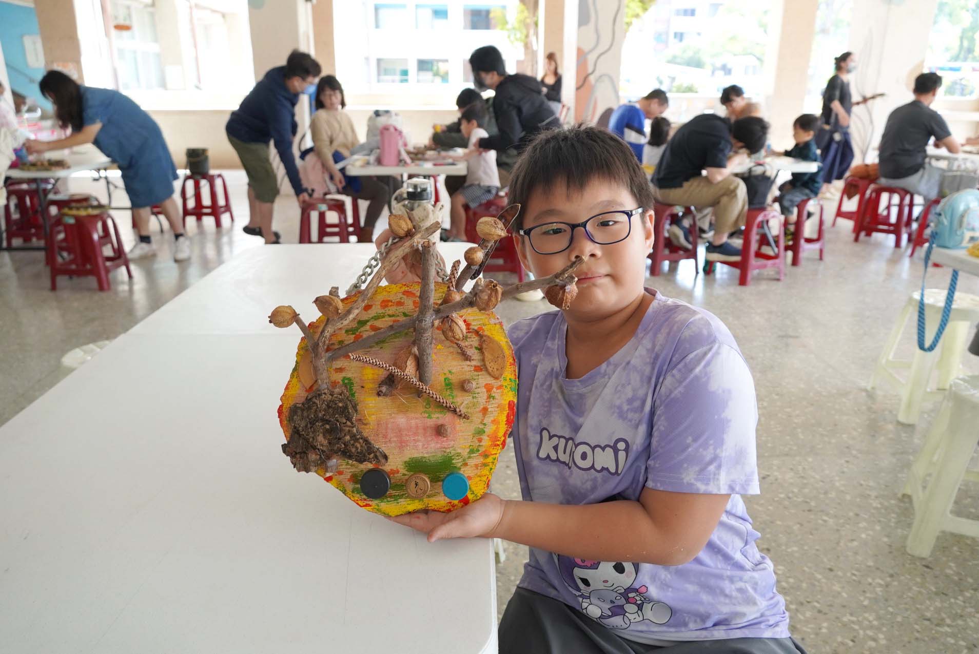高市社教館「穿越山林景觀~多功能掛飾」活動3月8日在新興區大同國小舉行,邀請李月琴指導逾百名親子利用木片、樹皮、果實、蔬果核等隨手可得素材,體驗彩繪樂趣、創作掛鉤及具擴香功能吊飾,市議員許采蓁服務處秘書許伃嘉、新興區大同國小校長陳詠禎、主任吳淑鈴、社教館秘書姜淑菁等人到場同樂,左營區屏山國小學生陳芬比說,感謝母親陪伴,活動有趣,利用果實創作蝸牛、毛毛蟲及大樹,新興區新興國小學生黃奎越說,開心能和母親報名參與,發想創作立體樹。