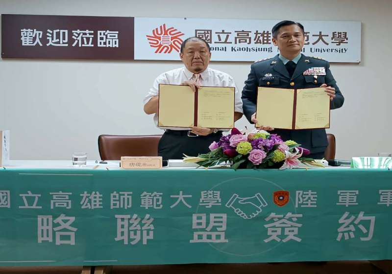 國立高雄師範大學副校長唐硯漁(圖一左)10月29與陸軍軍官學校教育長黃孫德昌(圖一右)簽署合作協議書,締結策略聯盟,深化設備技術資源分享、專題研究與成果交流、合辦學術研討會、師生學術交流等合作關係,同時秉持互惠原則開放兩校學生互選課程及推動教師與研究人員技術交流,高師大也鼓勵在校生報考大學儲備軍官(ROTC)或專業軍官班,陸官畢業生選讀高師大研究所深造,並開放學生選擇陸官教師指導完成研究。圖/高師大提供、文/高培德