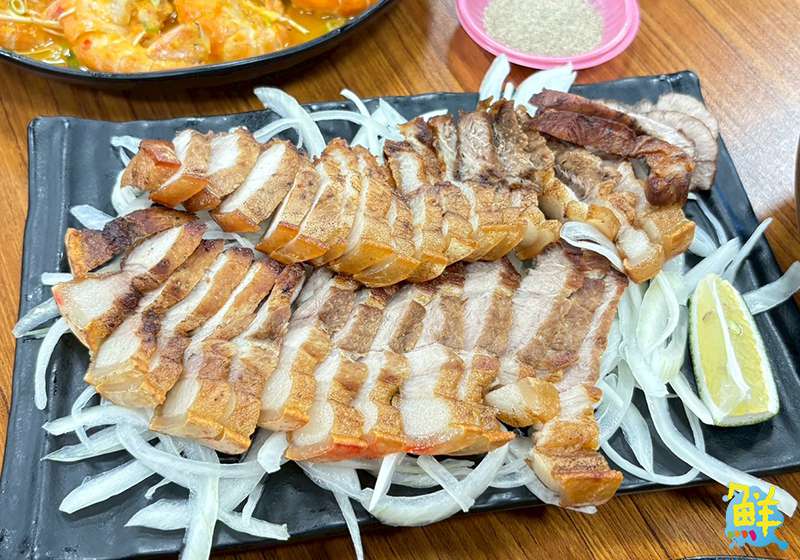▲烤鹹豬肉:外層微焦、香氣四溢,入口鹹香濃郁,伴隨著迷人的炭火氣息。