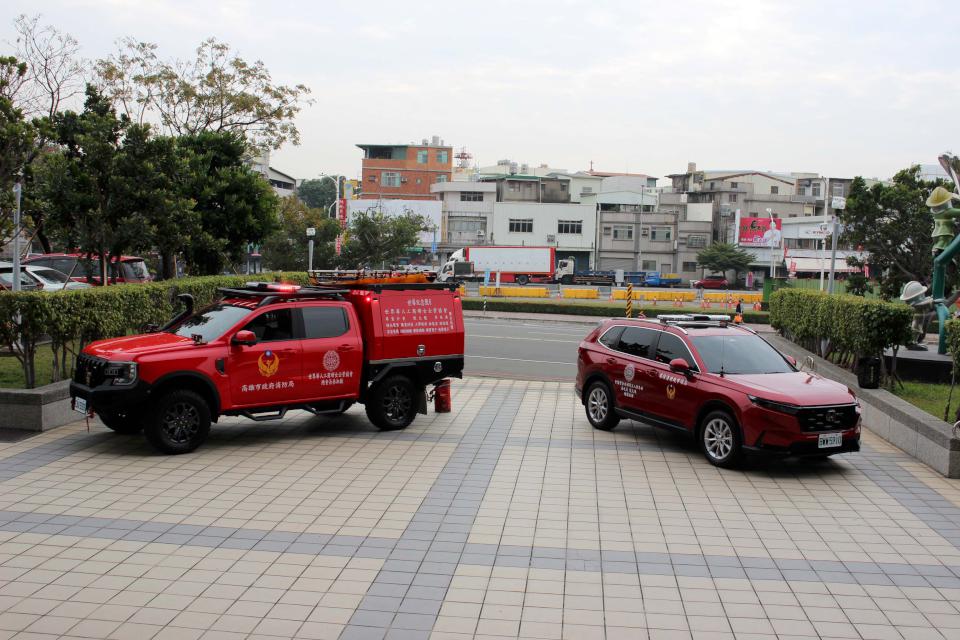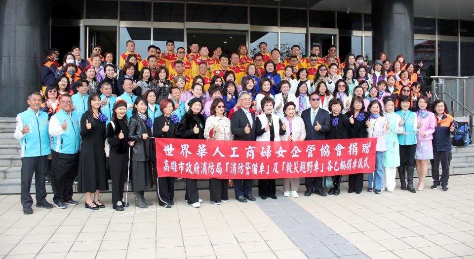 世界華人工商婦女企管協會總會長林淑敏1月9日捐贈市值逾500萬元消防警備車及救災越野車各一輛,高市府消防局局長王志平、高市義勇消防總隊總隊長陳義永等人代表接受並回贈感謝狀,消防救災越野車採貨卡設計,後斗配置繩索救援準備收納艙,車頂可放置三腳架、擔架、帳棚,底盤加高強化可通過泥濘崎嶇地形,車架繩索固定點適用山林等各類複雜災害搜救,警備車支援巡查警戒、災情回報與指揮聯繫,有助強化特種搜救及災害應變量能。圖與文/高培德