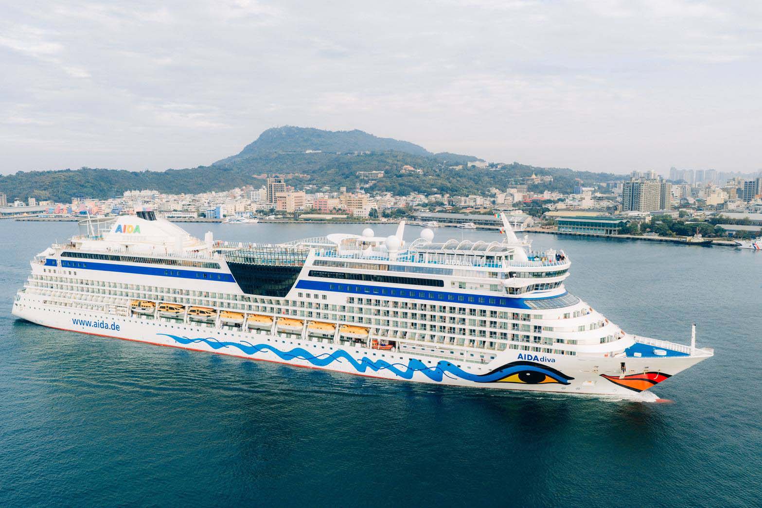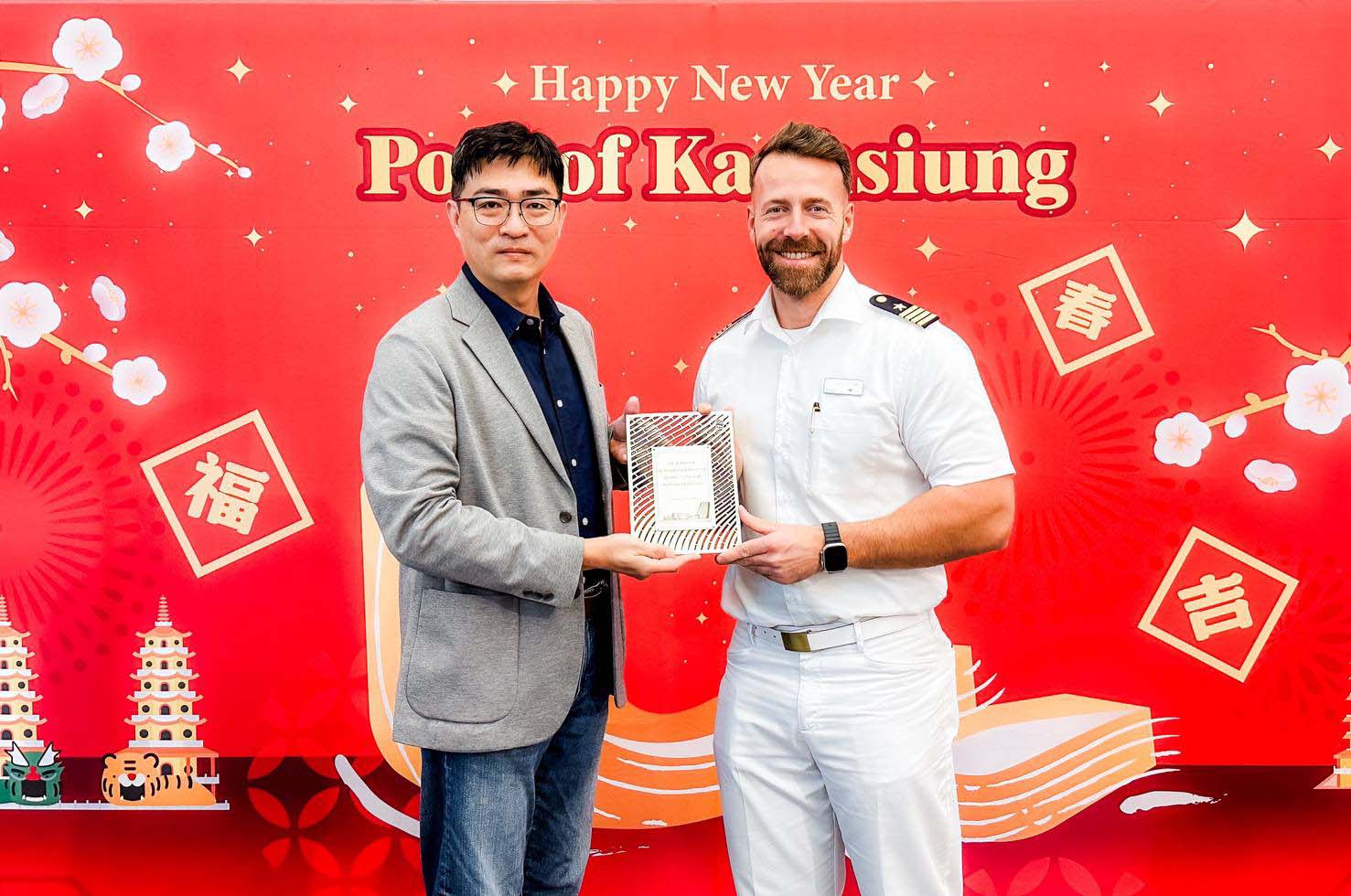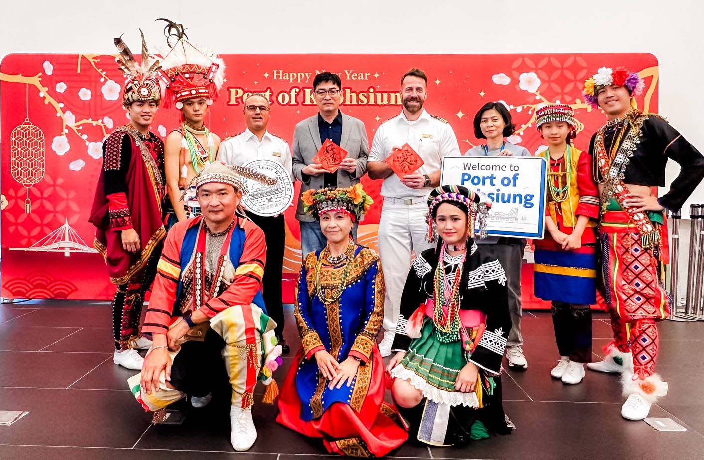 高雄港1月25日喜迎愛達郵輪愛達女神(AIDAdiva)與麗星郵輪探索星號(Star Navigator)接力泊靠,臺灣高雄港務噴水並由處長蔡建郎(圖二左)代表致贈愛達女神船長(圖二右)首航紀念牌,還結合高市海洋局原住民傳統舞蹈表演,喜迎1970名旅客,也安排乘客體驗手寫春聯。