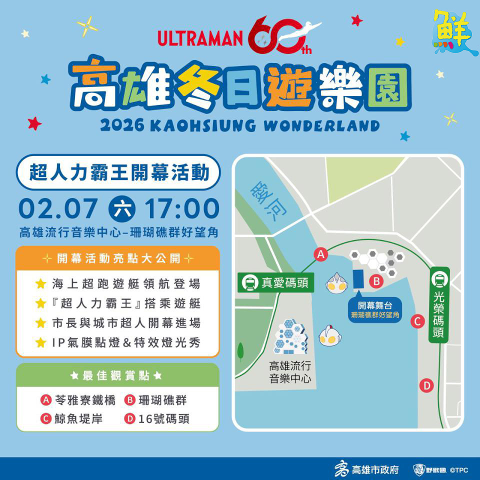 「2026高雄冬日遊樂園」將於2月7日下午5點在愛河灣珊瑚礁群好望角盛大開幕,並於3月1日結束。開幕活動特別規劃超人力霸王角色同時於海域與陸域登場,更邀請近60位「城市超人」,包括鏟子超人、救災救護、維護社會秩序及交通疏運等守護城市的英雄與陳其邁市長一同揭開序幕;誠摯邀請全國民眾來到高雄愛河灣活動現場,感受光與希望的節慶氛圍!