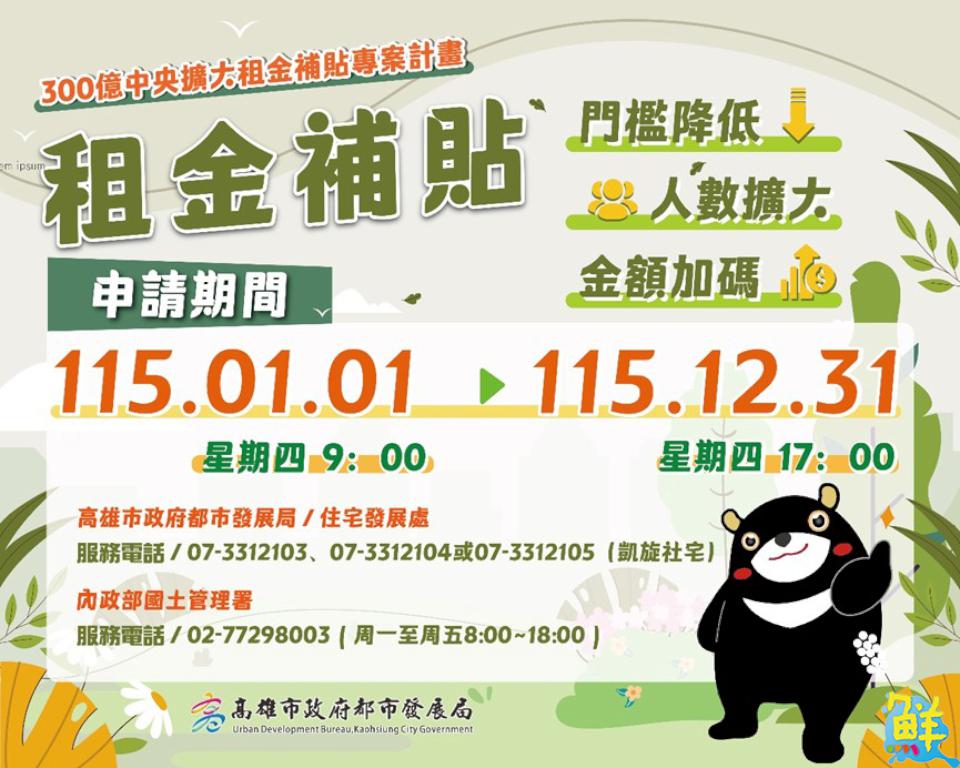 高雄市都發局自111年起開辦「300億元中央擴大租金補貼專案計畫」,全國申辦受理件數超過75萬戶,今(115)年度持續推動租金補貼專案,為租屋族群減輕租金負擔、提升生活品質。現場申請請於受理期間之上班時間至苓雅區凱旋青樹社會住宅一樓住宅補貼服務辦公室(苓雅區凱旋一路160號1樓)洽辦;中央300億擴大租金補貼線上申請網址:https://has.cpami.gov.tw/subsidyOnline/house300e/;另郵寄申請書表可就近到各區公所索取,或直接到申請網站下載即可。