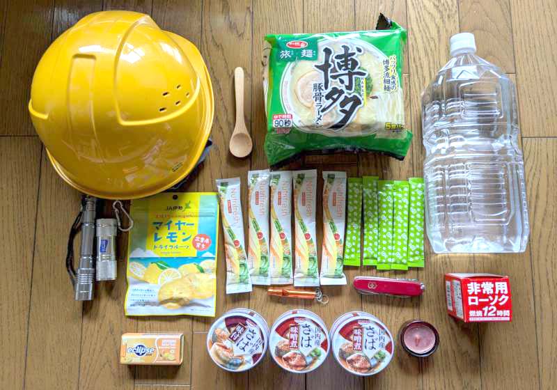 其實,防災準備並不是要一次買齊很多東西,而是從生活裡慢慢累積。我在玄關放著一雙不用綁鞋帶、方便穿脫的布鞋。另外再準備生活上的物品。先從水、蠟燭、安全帽、現金,再補充罐頭、藥品、行動電源等等。這樣做比較不會有壓力,也比較容易持續下去。