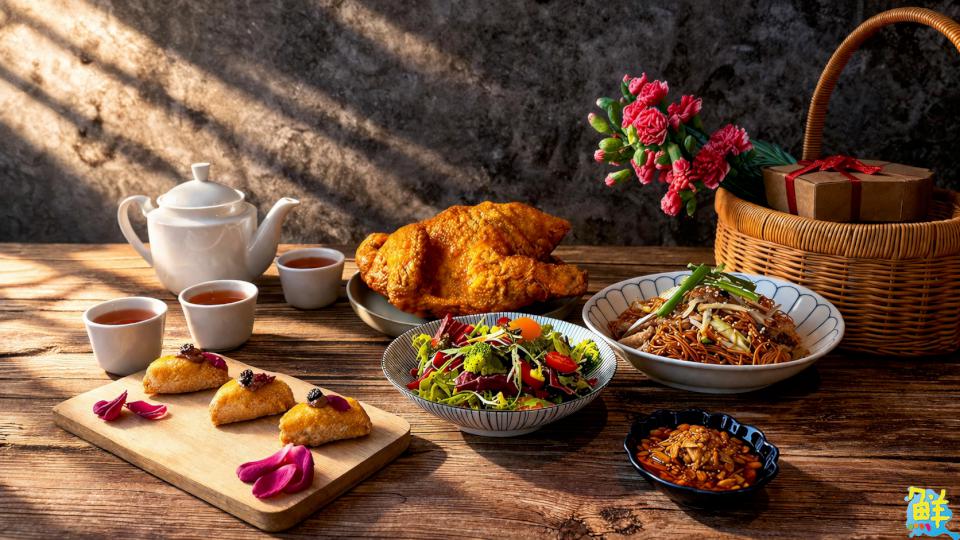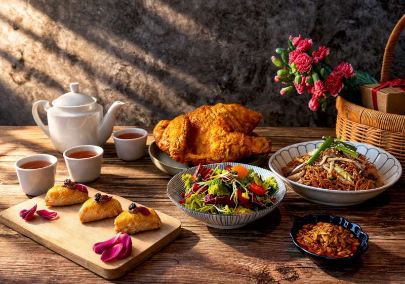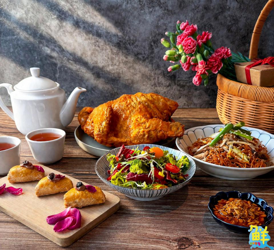 針對居家慶祝需求,茶樓精選外賣於5月1日至5月10日推出限時外帶方案,採三日前預訂制。其中「純粹愛媽咪・鹽焗雞禮籃」集結黃金鹽焗雞、堅果田園蔬、豉油皇炒麵與手工玫瑰酥,適合3人份食用優惠價900元,換算每人300元,主打高CP值;「經典一鴨三吃套餐」則為3,880元, 包含片鴨、滷水拼盤、酸菜鴨架米粉湯,並搭配炙烤戰斧豬與港式點心、港點甜品等,兩款皆需提前三日預訂。
