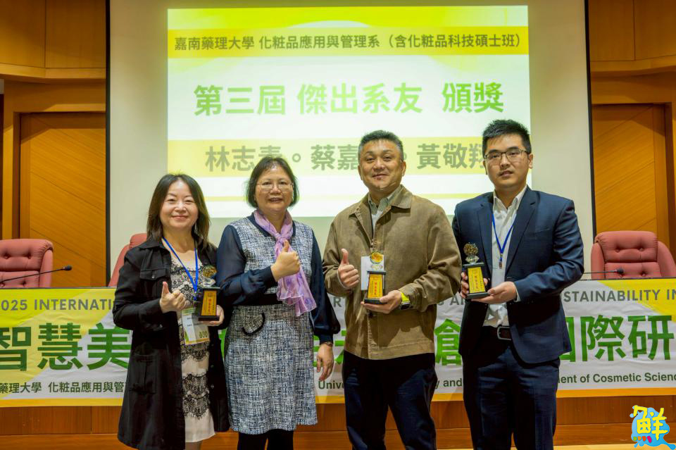 為表彰系友在產業界的卓越貢獻,大會特別頒發第三屆傑出系友獎予林志青、蔡嘉惠及黃敬翔,肯定在美粧研發、經營管理與技術創新領域的卓越成就,為學弟妹樹立學習典範。
