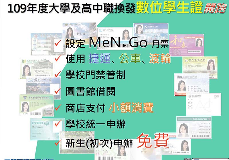 高市交通局規劃結合學生證及電子票證等多卡合一功能,選定全市16所大專院校、19所公私立高中職及1所宗教研修學院發行數位學生證,109年預計換發60000張,鼓勵學生善用公共運輸系統,降低汽機車交通事故風險。