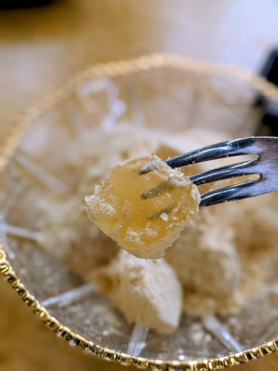 用名水製作的蕨餅,質地格外柔軟、清涼,叉子切下的瞬間,切面透明得幾乎能透光。
