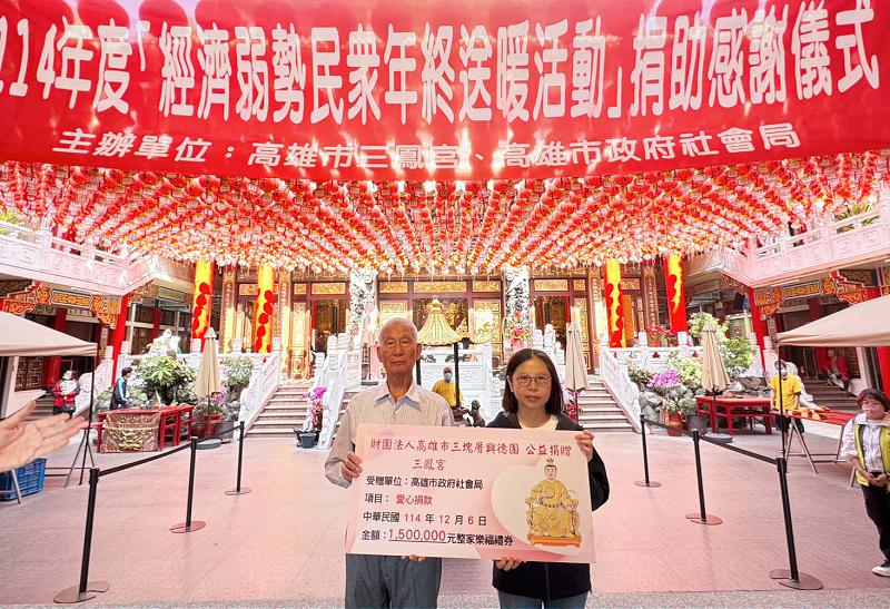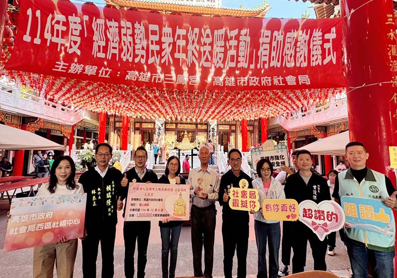 高市社會局4社福中心攜手三鳳宮 賑濟500戶弱勢家庭連鎖量販店禮券 2025/12/06 高培德 5682高市社會局三民、新興、左營及楠梓社會福利服務中心攜手三鳳宮12月6日合辦年終送暖活動,賑濟廟方提供連鎖量販店禮券150萬元嘉惠500戶弱勢家庭,社會局長蔡宛芬頒狀感謝三鳳宮董事長孫宗英長期投身公益、關懷弱勢,全市現有18處社福中心,結合民間團體、企業等各界資源,及時伸援受助對象。圖/社會局提供、文/高培德