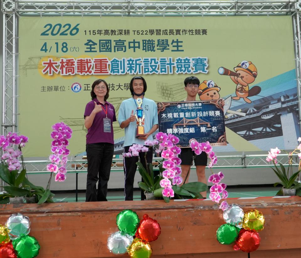 秀水高工建築科拿下最大強度組第一名,學生劉浿莘說,團隊持續修正學習精進作品,台南大學附中綜高營建技術學程榮膺精準強度組第一名,學生李宗穎感謝隊友與指導老師支持。圖/正修科大提供、文/高培德