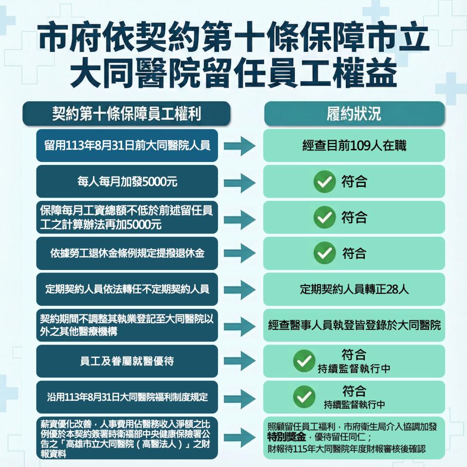 高市大同醫院經營權移轉長庚醫療財團法人屆滿1週年,原醫事人員1月8日齊聚市府四維行政中心陳情,要求保障工作權及應有福利,衛生局回應表示,協調院方加碼特別獎金補足薪資差異,據了解,長庚醫院每人每月加薪5000元,並納入年終獎金及退休金計算,實質加薪逾70000元,轉手經營第一年添購醫療設備導致無盈餘,不克分紅,衛生局協調院方公告1月下旬加發特別獎金,慰勉留任員工辛勞。