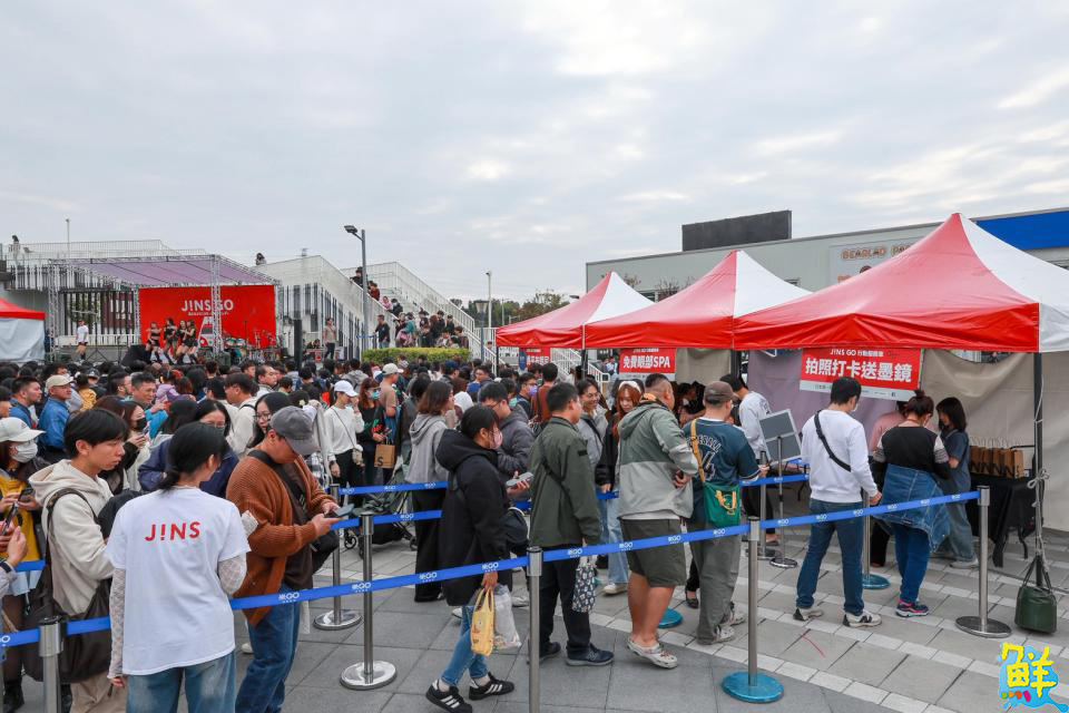 ▲JINS GO開進臺南,除了有打卡送墨鏡活動,小紅胖卡也配有專業視光人員提供調整眼鏡、配鏡諮詢服務,吸引民眾大排長龍,爭相體驗。