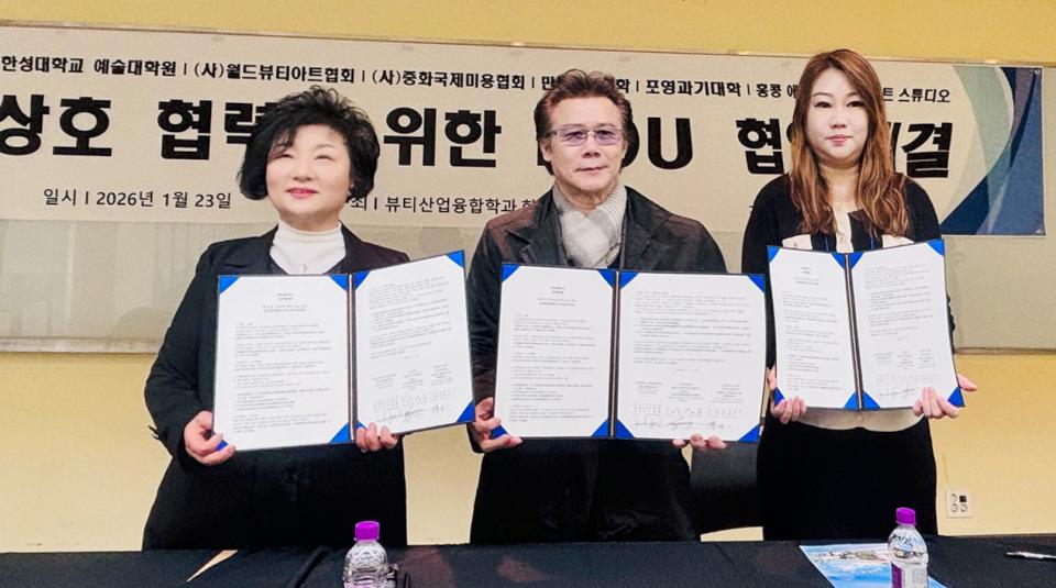 高市輔英科技大學健美、應材系師生參與韓國第24屆世界美容藝術與設計國際大賽囊括5金、3銀、1銅,其中包括健康美容系助理教授黃曉玲「臉部護理」、黃嫃穎創意飾品與創意美甲金牌、創意美睫銀牌、應用化學及材料科學系林冠呈《Veridian》男士香水金牌、金牌陳喻鈅、銀牌石欣雅、楊舒淳、銅牌陳宜姍,黃曉玲並與韓國漢城大學藝術研究所(Hansung University)院長Jeon, Jong-Chan及世界美容藝術設計協會(WBAA)會長朴惠卿簽署合作備忘錄(MOU),校長林爵士說,健美系師生國內外競賽屢創佳績,拓展學生國際視野,累積實戰經驗,並樂見與國外大學及協會合作。圖/輔英科大提供、文/高培德