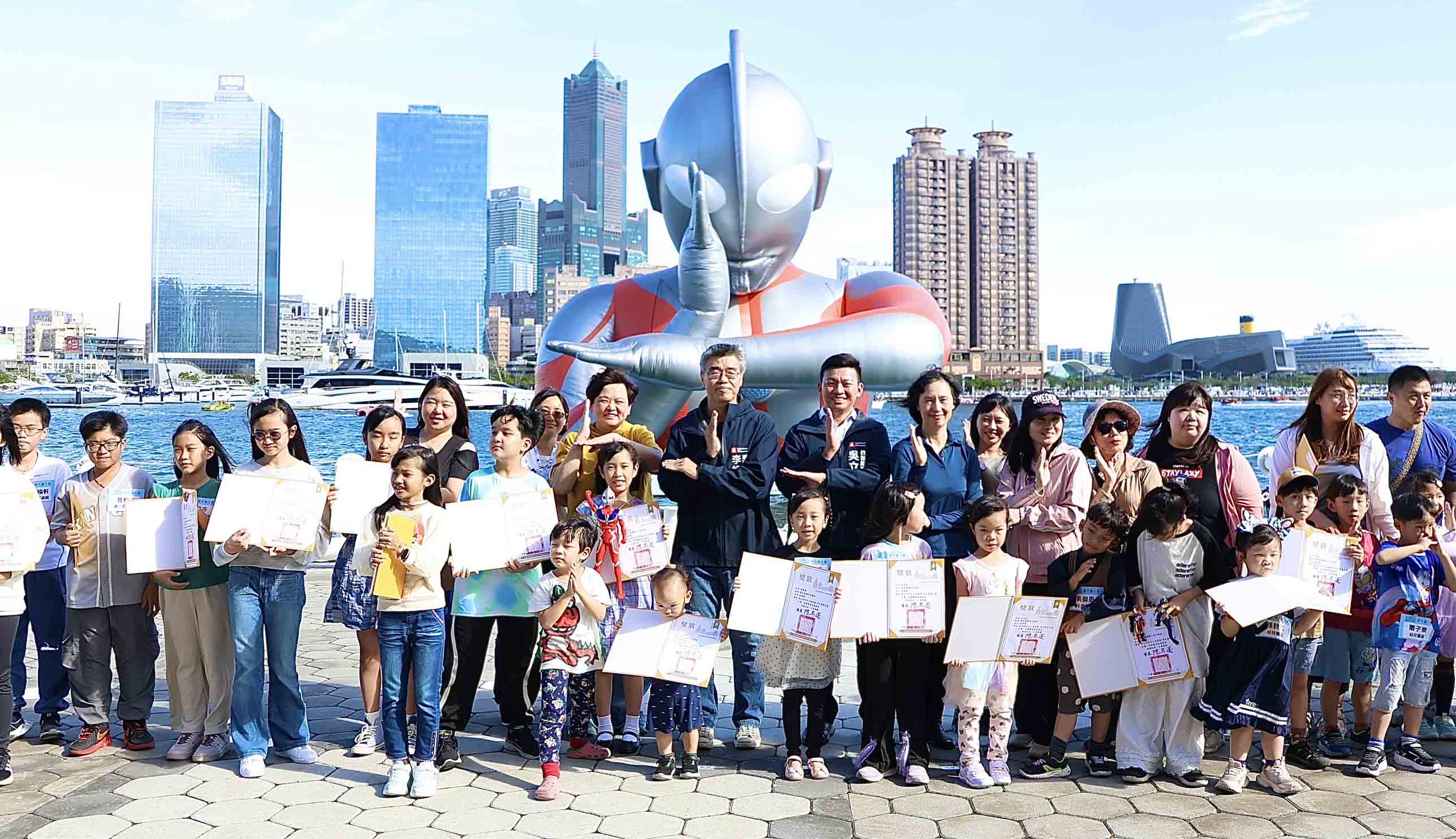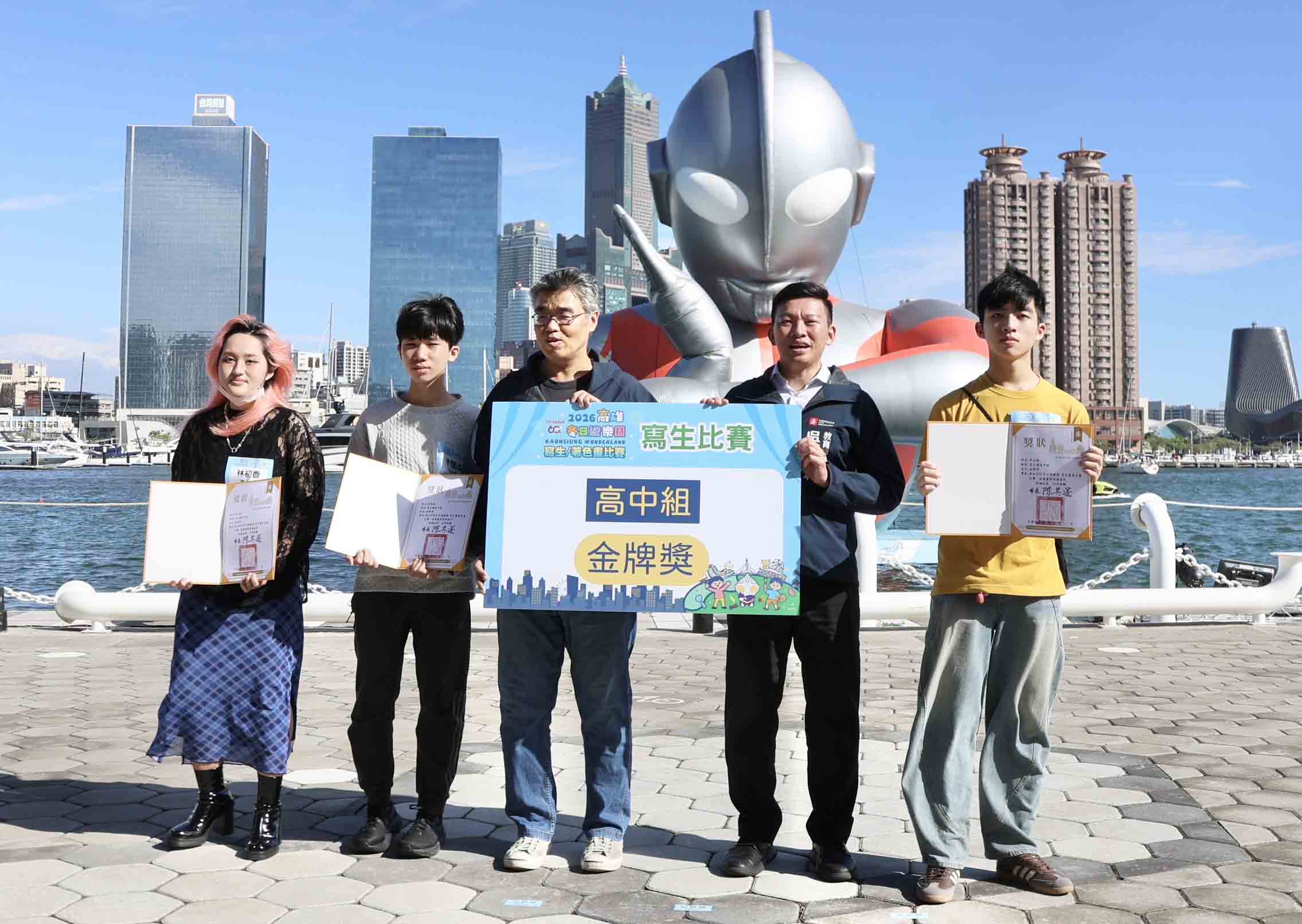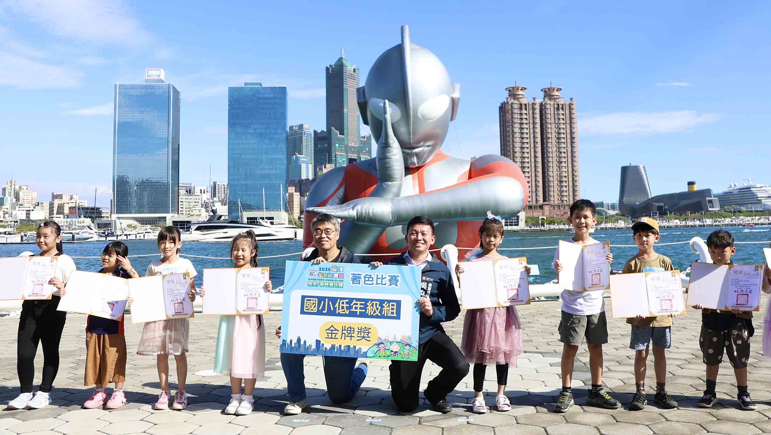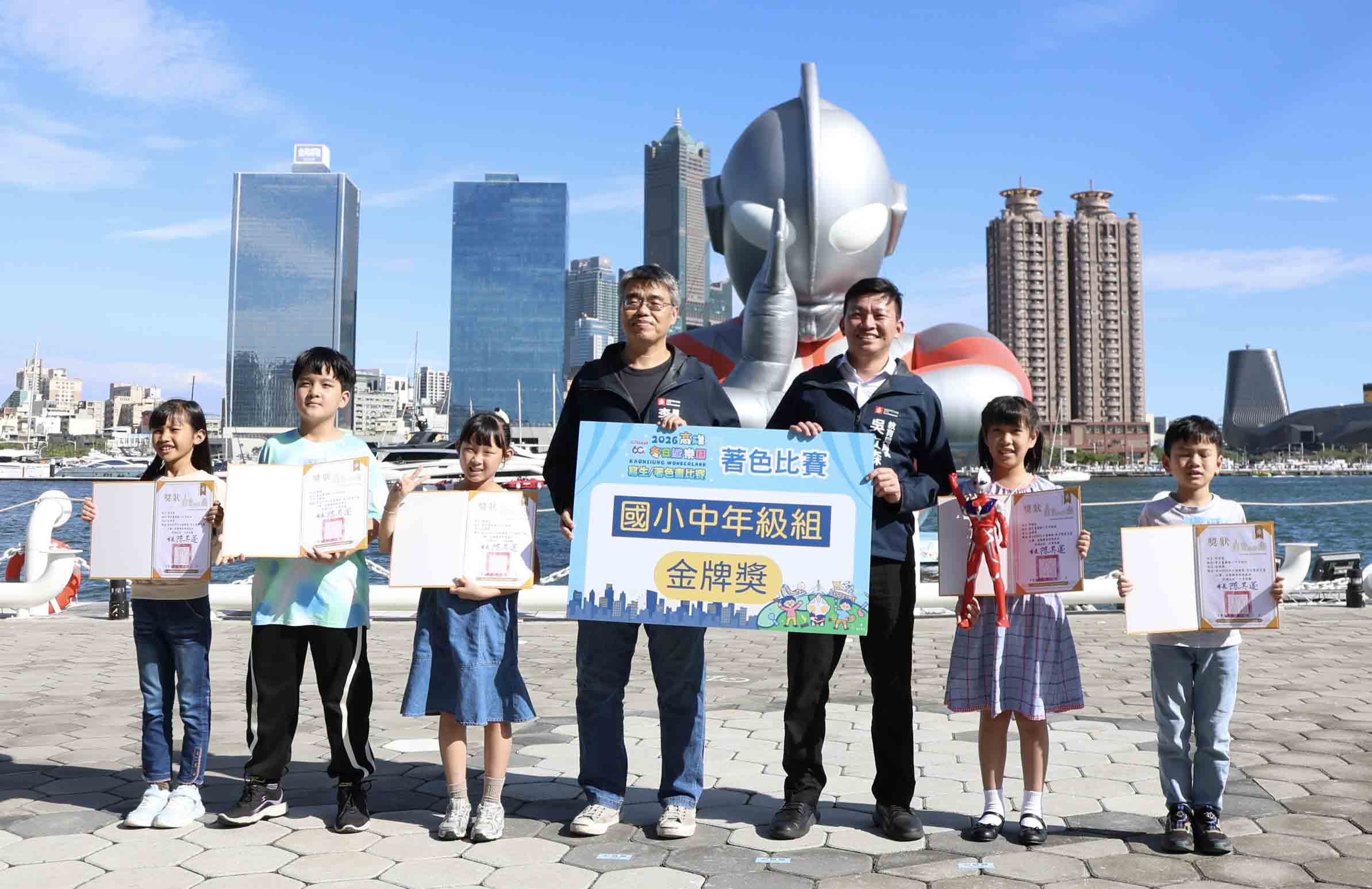 高市教育局2026 冬日遊樂園(Kaohsiung Wonderland)寫生暨著色比賽2月20日至22日在高雄港18號碼頭舉行,吸引8414名學生參與,帶動超過3萬人造訪,3月1日頒獎典禮,副市長李懷仁、教育局長吳立森與 48名金牌得主齊聚高雄流行音樂中心音浪塔合體初代超人力霸王,接受眾人喝采。