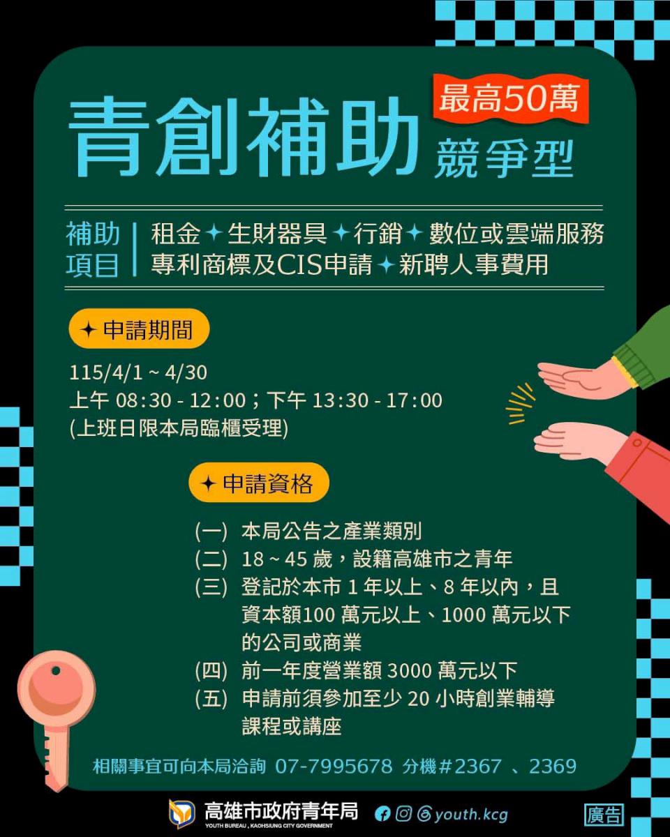 高市青年局113年首推競爭型青創補助,提供具一定規模青創團隊資金挹注,115年計畫4月1日至30日開放設立登記高市1至8年數位內容、綠色能源、生技醫藥、醫材與金屬關聯性、資通訊、智慧電子、半導體與高值化材料、電動車、文化創意、運動休閒等領域公司或商業,實收資本額100萬至1000萬元、114年度營業額未滿3000萬元、代表人或負責人設籍高市18歲至45歲並完成至少20小時線上或實體創業輔導課程或講座申請,每件補助涵蓋營業場所租金、生財器具、業務行銷、數位或雲端服務、專利或商標申請規費、委託、企業品牌識別(CIS)設計、新聘人事等費用,單一項目最高70%,每項上限30萬元,合計最高50萬元,青年局長林楷軒(圖三左)說,多數青創事業站穩腳步,面臨品牌拓展、設備升級與市場行銷等挑戰,競爭型青創補助期能加速業者擴大營運規模,強化體質,挺過關鍵時刻。