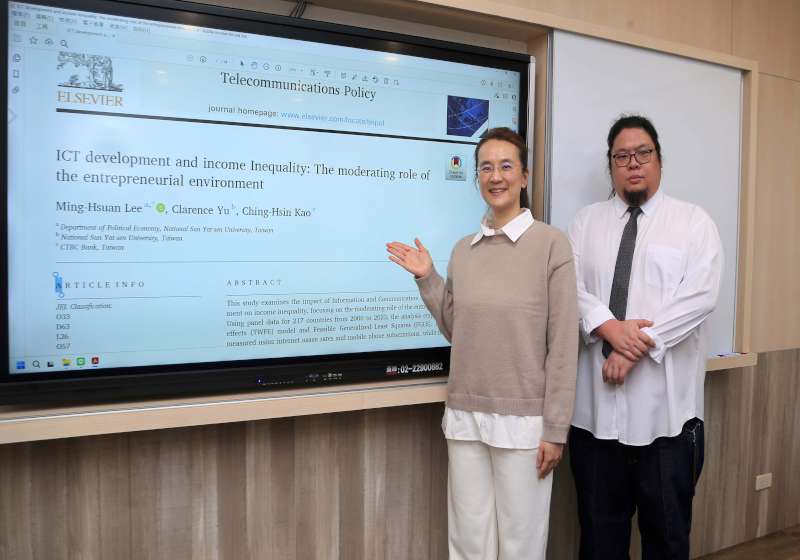 國立中山大學國際長、政治經濟系教授李明軒(圖左,右為共同作者余凱倫)長期分析跨國資料發現資通訊科技(ICT)發展有助弭平所得不均,另發揮補償性功能,降低弱勢族群進入市場門檻,縮小貧富差距,李明軒說,續強化偏鄉山區數位連結擴大成效,結果榮獲世界頂尖期刊電信政策(Telecommunications Policy)採用。