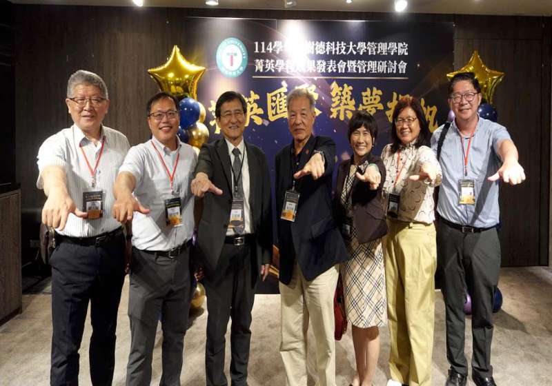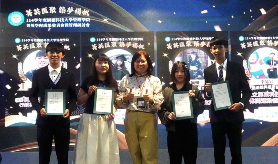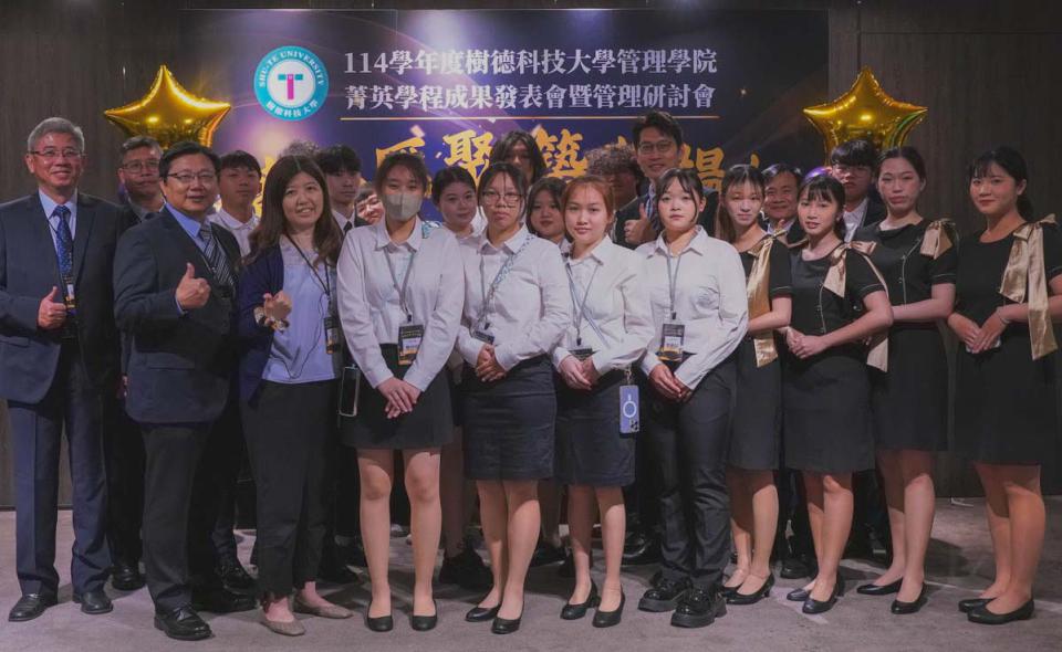 高市樹德科技大學管理學院4月18日舉行114學年度菁英學程成果發表會暨管理研討會,主題定為「菁英匯聚,築夢揚帆」, 會中表揚28名錄取研究所學生,其中19人直升國立大學,4名學生考取逾10張證照、6人獲選實務菁英,高雄高商校長劉人誠、三民家商校長王雪娥(圖三中)、鳳山商工校長林建宏、海青工商校長黃珮玉、樹德家商教務主任謝韻婷及餐飲科主任洪千田、中山工商校長李昱平、立志高級中學校長陳峰斌、復華高級中學校長詹耀宗、仁武高級中學校長余忠潔、林園高級中學校長陳冠璋、旗山農工校長潘致強及大榮高級中學校長張簡助立等人見證。