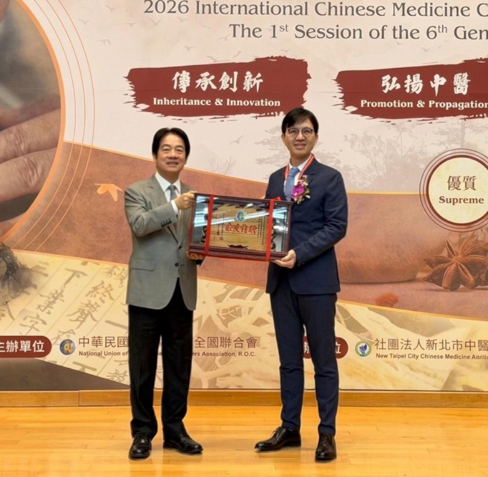 中醫師公會全國聯合會2026國際中醫藥臨床學術大會3月8日舉行,同步表揚第三屆中醫師華佗醫療奉獻獎得主,高雄長庚醫院中醫部主任蔡明諺(圖一右)長期投身學術研究及實證醫學獲頒學術研究奉獻獎,從總統賴清德(圖一左)手中接過獎座。