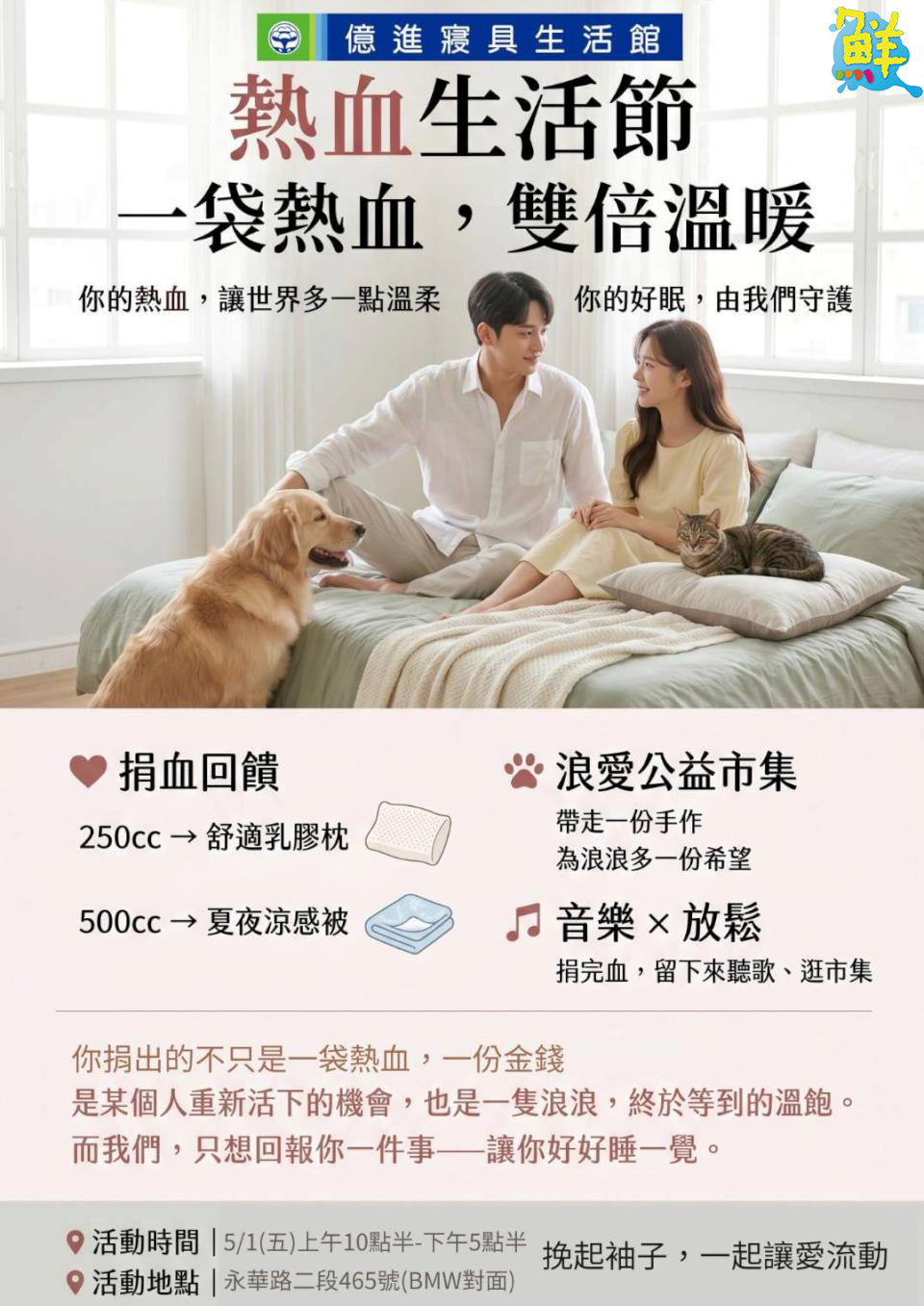 ▲億進寢具將於2026年5月1日(五)上午10時30分至下午5時30分,在台南安平永華門市(永華路二段465號)舉辦《熱血生活節》,邀請民眾挽袖捐血,讓熱血成為幫助他人的力量。