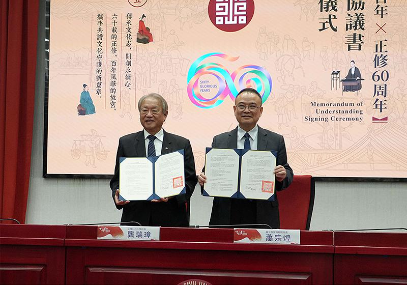 高市正修科技大學校長龔瑞璋(圖一左)9月19日與國立故宮博物院院長蕭宗煌(圖一右)簽署合作協議書,宣示攜手培育人才、技術合作、推廣教育等,推動台灣躋身亞太地區文物修護據點,蕭勤國際文化藝術基金會董事長吳素琴等人歡喜見證,正修科大歡慶創校60週年,即日起至115年1月9日在行政大樓11樓藝術中心推出「向天狼星致敬—蕭勤捐贈作品修復研究特展」,主題聚焦作品展示、修復研究與沉浸式劇場,展示蕭勤捐贈作品修復成果。龔瑞璋說,感謝蕭勤國際文化基金會捐贈畫作,驅動藝術保存,期能結合故宮挹注修護研究資源,提升專業量能及深化國際合作。國立成功大學教授蕭瓊瑞受邀主講「永遠的天狼星」時說,蕭勤身兼藝術家、哲學家,創作融合東方符號、宇宙意象與生命經驗,形塑特有藝術語言。圖與文/高培德