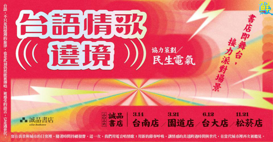 因應白色情人節到來,誠品書店自3月14日起首度推出「台語情歌遶境」,邀請派對DJ品牌「民生電氣」巡迴北中南,帶來多首經典台語情歌的現場刷碟演出。活動首站於誠品書店台南登場,之後將前往台中園道店、台大店及松菸24小時書店,以充滿節奏感的DJ演出,帶領樂迷感受正港台式情人節氛圍。