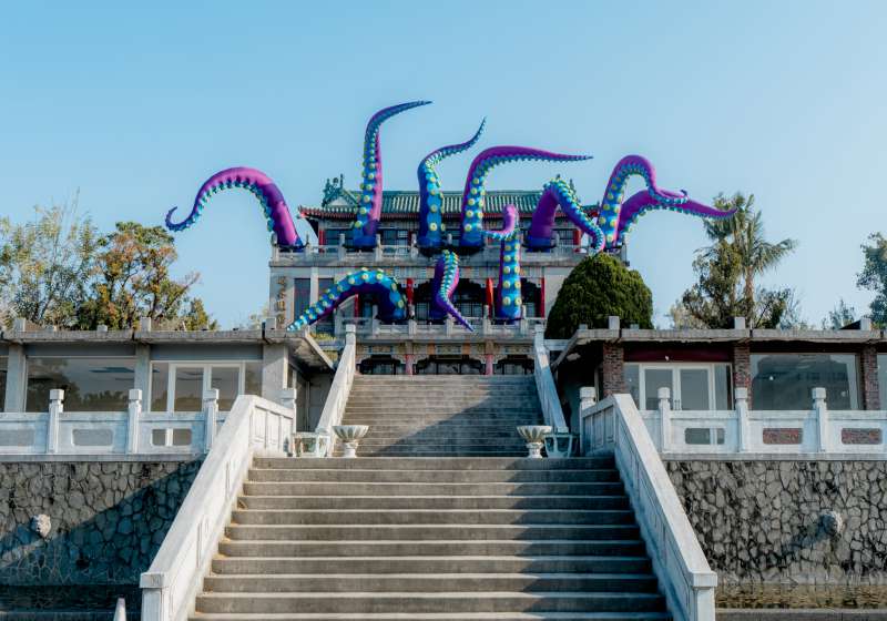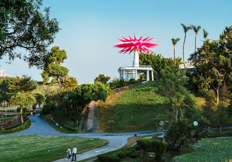 高市文化局攜手美術館力邀英國藝術家Steve Messam、Filthy Luker(痞子路克)、台灣藝術家張騰遠、尹子潔、林建榮、陳普等人打造粉紅色加冕《Crown 冠》(圖一)藏身樹梢觀察人類《果嶺大眼睛》(圖二)、《章魚來襲》(圖三)、放大 350 倍「鸚鵡模仿術—高爾夫球」(圖四)、《桃花果果開》、《菇菇屋》、《仙女圈》(圖五)、《繽紛城市‧明日亮點》(圖六)、《湖光新生》(圖七)等裝置藝術進駐高雄果嶺自然公園、澄清湖風景區,主題定為「森棲盎然」,歡迎大小朋友探秘,還有果嶺自然公園滯洪池高美館館藏、藝術家林建榮燈泡人,澄清湖景區兒童樂園大草坪陳普蛇頸龍化身怪獸穿越時空,吸引自然美好能量,入夜散發柔光,守護湖畔靜謐美好。圖/文化局提供、文/高培德