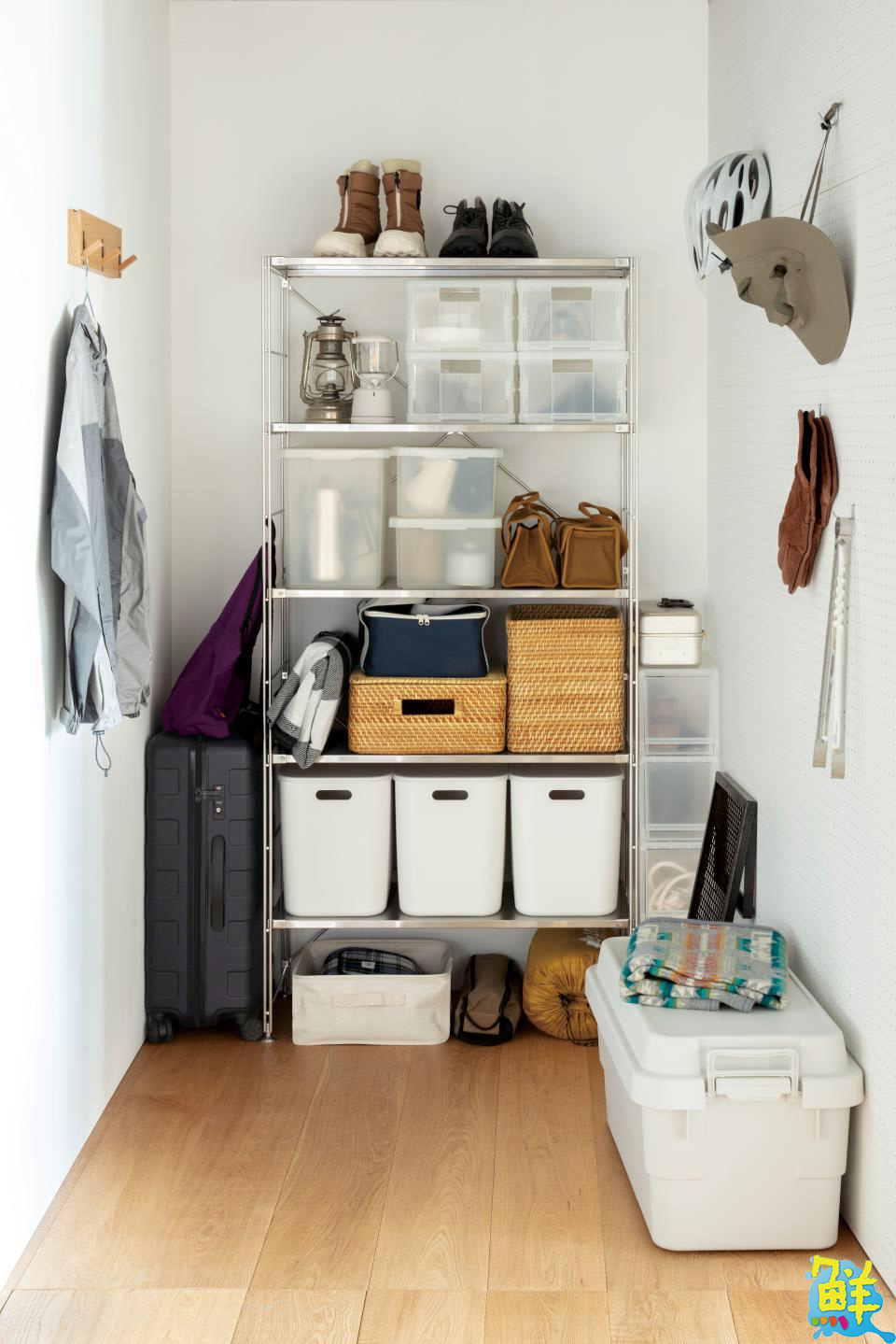 若居家空間不適合再添購層架作為收納主體,MUJI無印良品建議可於大門入口附近放置一座玄關衣帽架,讓外套與包包也能各就各位,一目瞭然。同時,針對全家人的外出鞋或室內拖鞋,則推薦鋼製鞋架作為專屬放置空間,確保大門出入口整齊有序。