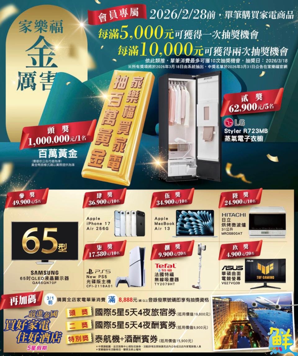 家電買氣不只止於抽獎,家樂福再加碼推出「前進泰國買好家電、住好酒店」活動,3月1日前家電單筆消費滿8,888元並完成發票登錄,即有機會抽中國際五星級旅宿或機加酒酬賓券。會員專屬優惠同樣吸睛,包括刷聯名卡回饋電子折價券、OPENPOINT點數最高10至30倍回饋,以及以點數搭配折價券換購家電的加碼方案,最低59元即可入手指定商品。