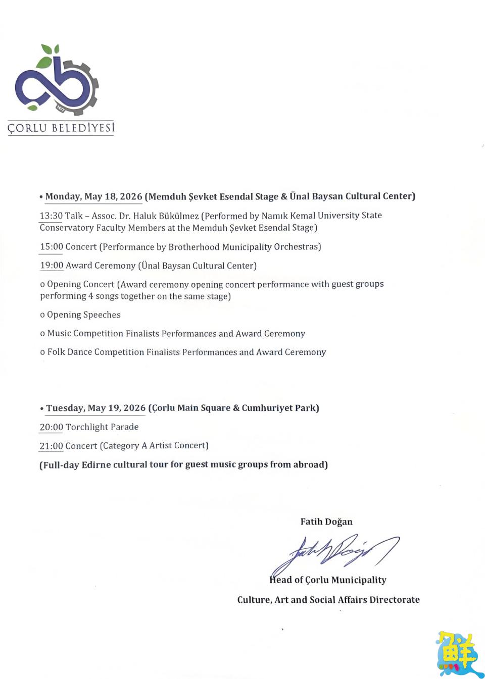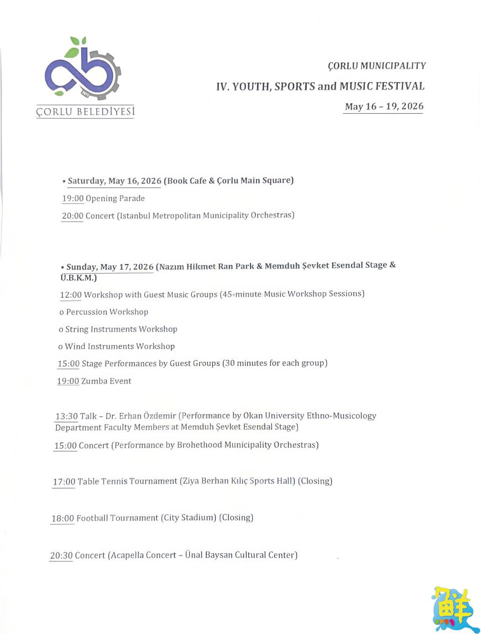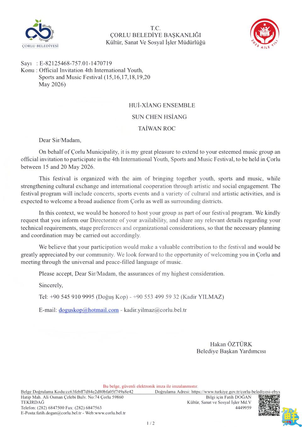 2026年5月中旬,臺灣音樂人林祐正將帶領「洄響樂坊」團隊,受喬爾盧市政府正式邀請,前往土耳其參與國際音樂節系列活動(5月14日至5月20日)。本次活動匯聚來自塞內加爾、科索沃、義大利、喬治亞及北塞普勒斯等多國藝術團隊,透過踩街遊行、文化交流、音樂論壇及系列演出,共同展現多元文化魅力。