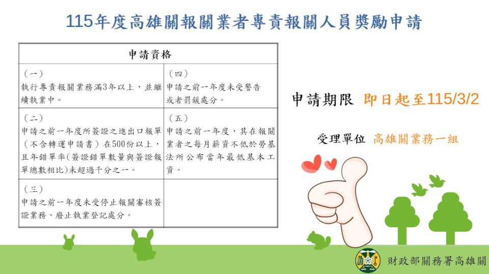 ★★★高雄關表揚115年特定報關業者 3月2日受理申請獎勵截止 2026/02/09 高培德 228財政部關務署高雄關115年頒狀表揚執行專責報關業務滿3年、申請前1年簽證進出口報單(轉運申請書除外)達500份且年錯單率(簽證錯單數量與簽證報單總數相比)未超過千分之一、申請前一年未受停止報關審核簽證業務、廢止執業登記處分、申請前一年未受警告或罰鍰處分、申請前一年度報關業者每月薪資達勞基法當年最低標準,即日起至3月2日可上高雄關官網下載申請書。圖/高雄關提供、文/高培德 #高雄捷運報 #高雄在地媒體 #高雄新聞 #鮮新聞 #高雄新聞網 #高雄關