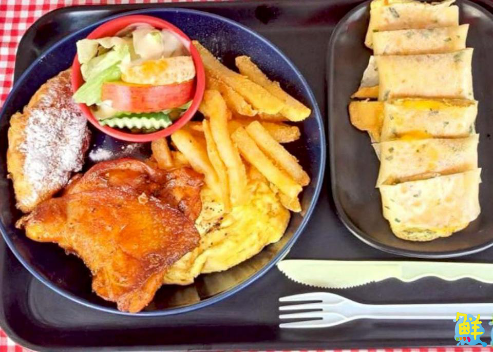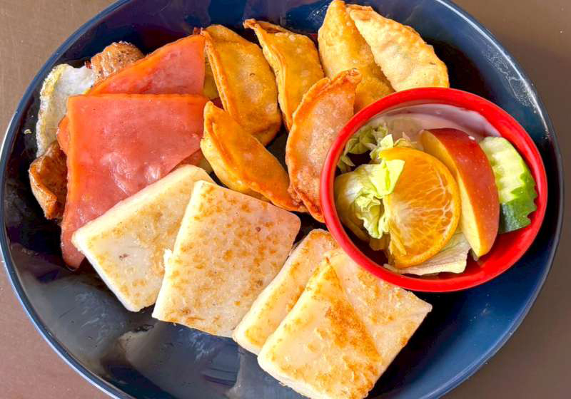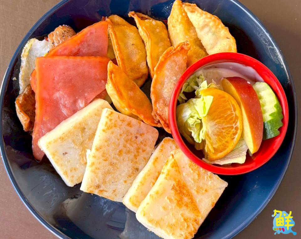▲台式古早味套餐:集結台式早餐常見的蘿蔔糕、火腿、荷包蛋,還有特別的炸水餃和水果沙拉,讓您吃得營養又有儀式感!