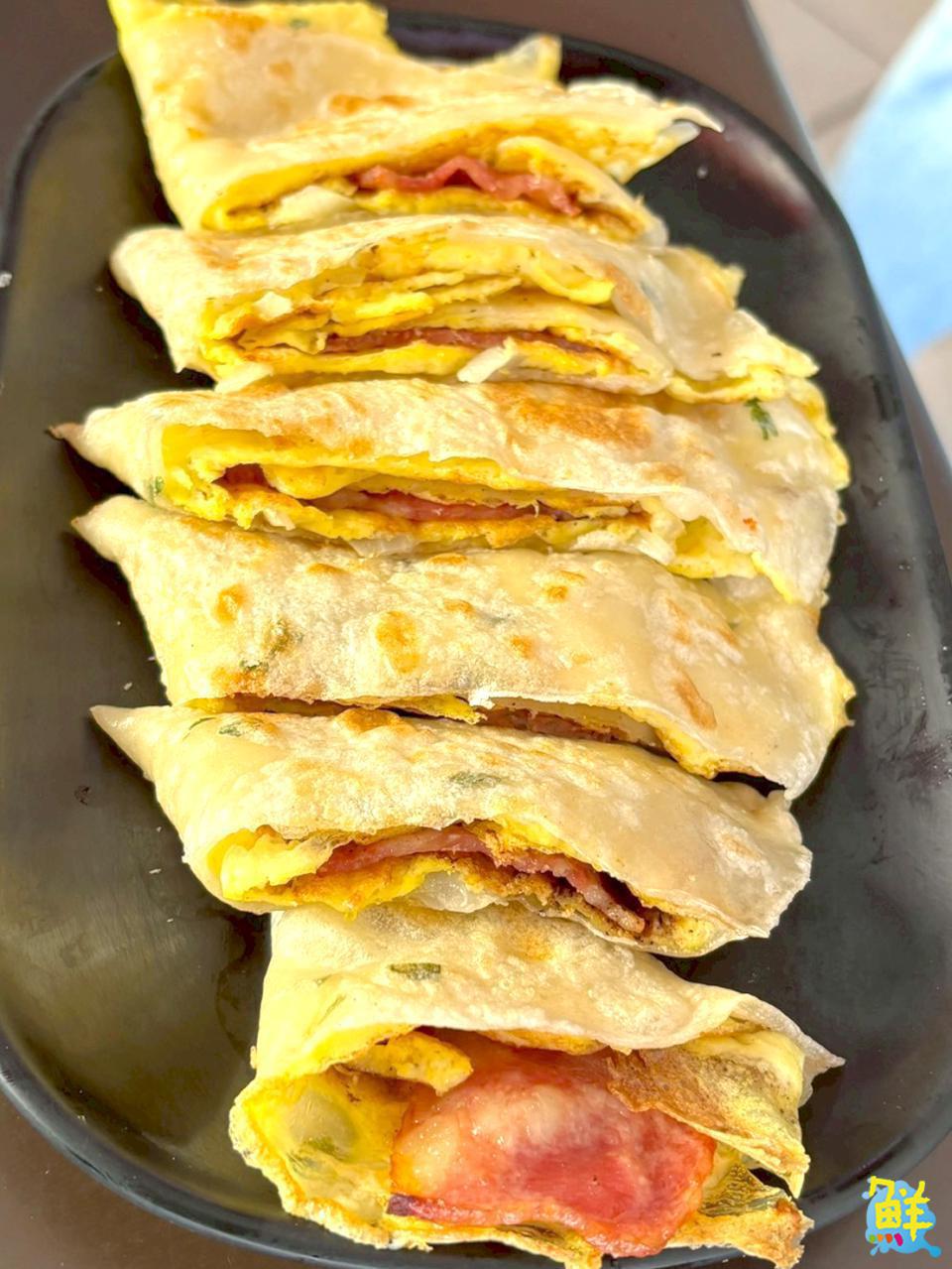 ▲培根蛋餅:餅皮煎得焦香,培根和蛋給好給滿,不怕你吃,就怕你餓!